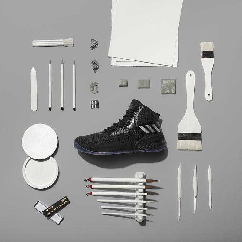 不同于以往国外设计师操刀主创,本次 adidas Basketball 特别邀请著名雕塑家任哲,以更贴近国人的艺术视角,传递新年主题。而本次 CNY 系列从筹备到实现历时一年多,哈登、利拉德、罗斯中国行均前往任哲工作室一同探讨设计。