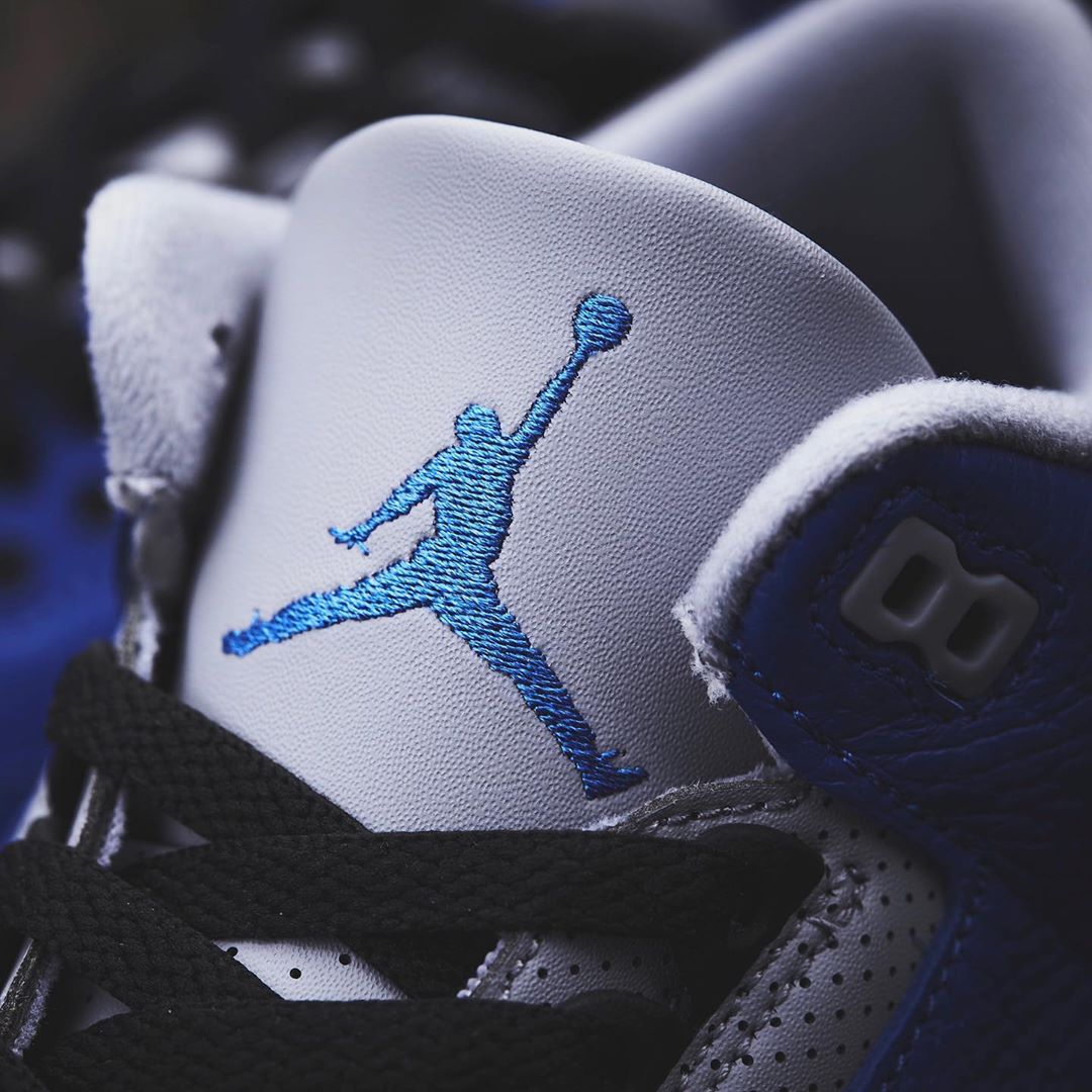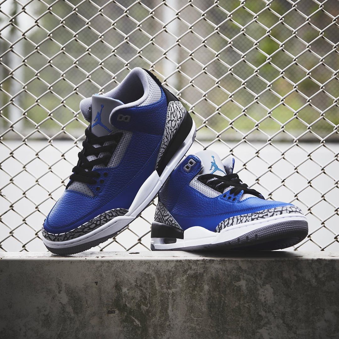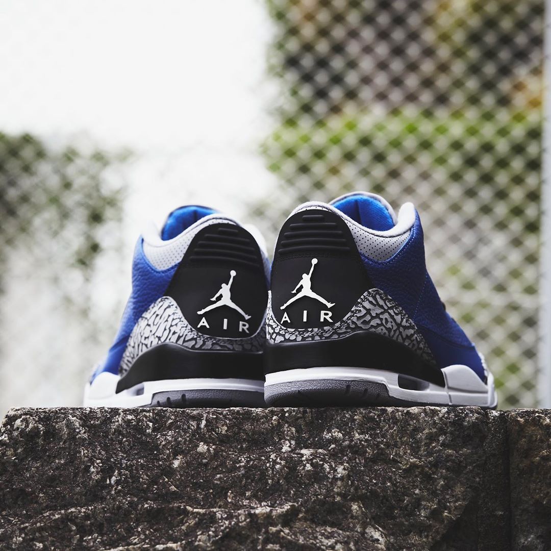 同样的皇家蓝主调,Air Jordan 3 最经典的爆裂纹元素,黑色的后跟中底,只有鞋舌和鞋帮的颜色以及后跟 Logo 存在细微的区别。