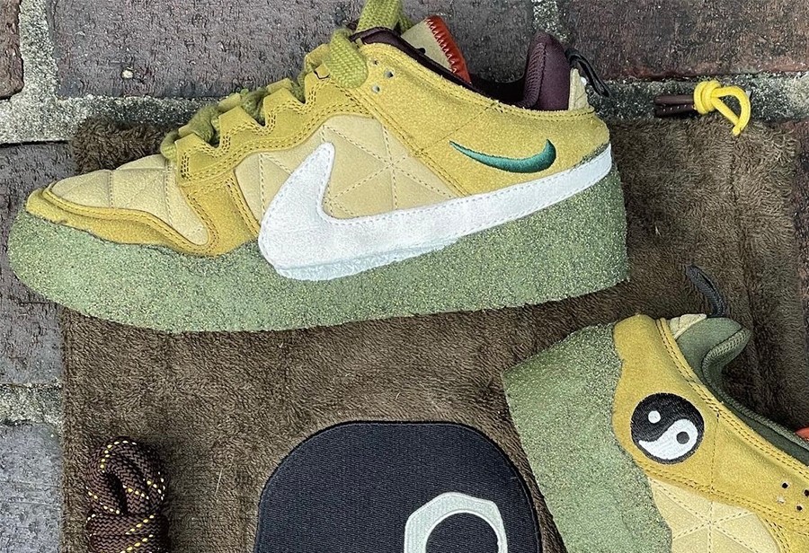 设计在 Dunk Low 的基础上做出极为大胆的创意改变,左右脚的细节各不相同。