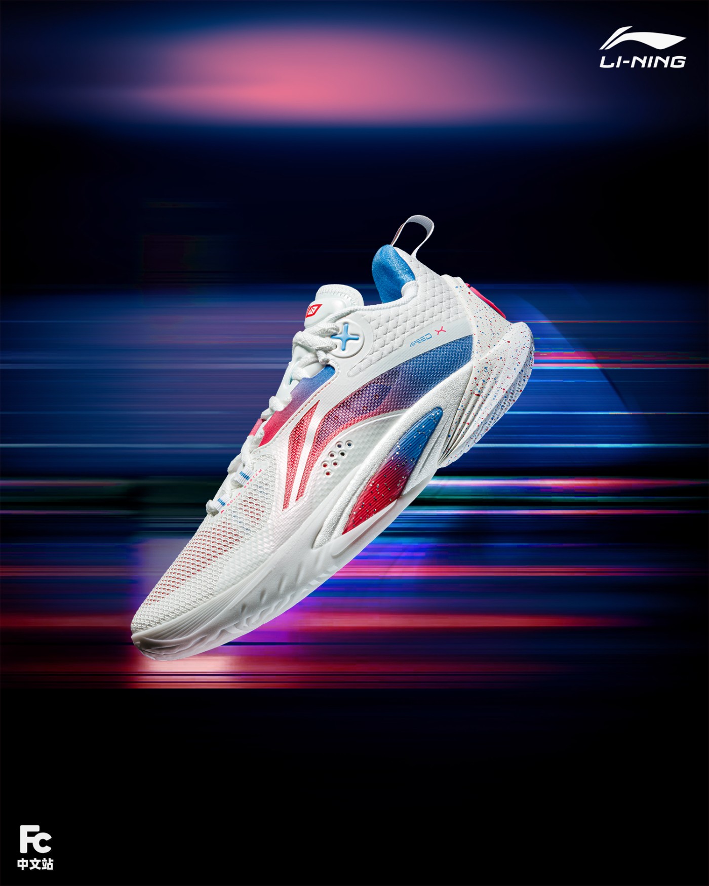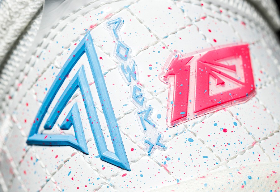 先说李宁闪击 10,整体大面积白色覆面,粉蓝渐变点缀,呈现出 LPL 标志性的蓝红撞色,视觉效果拉满。