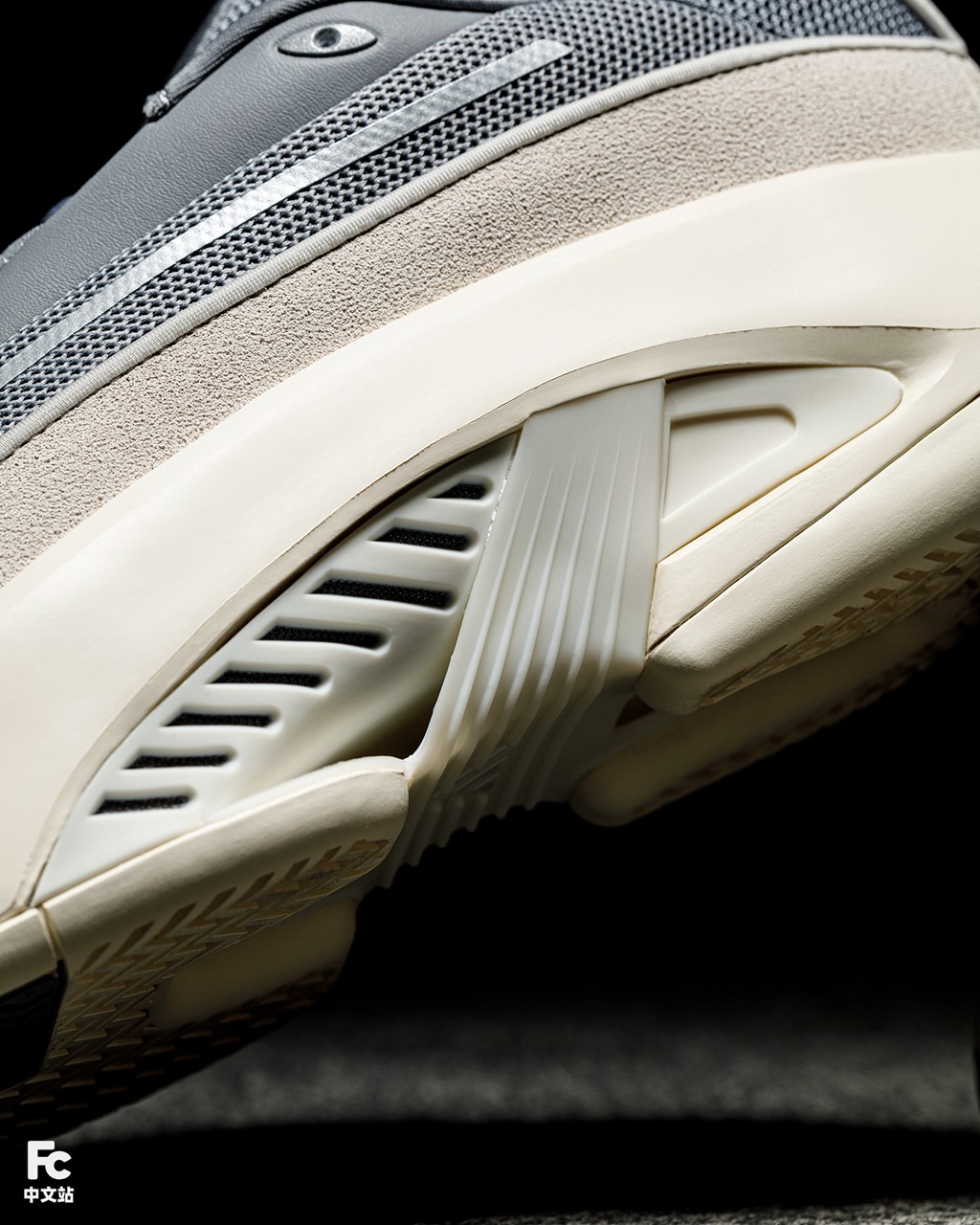 从侧面可以看出整双鞋的层次非常多,最下面一层的外底上,中部带有镂空结构,这部分我们之后再讲。