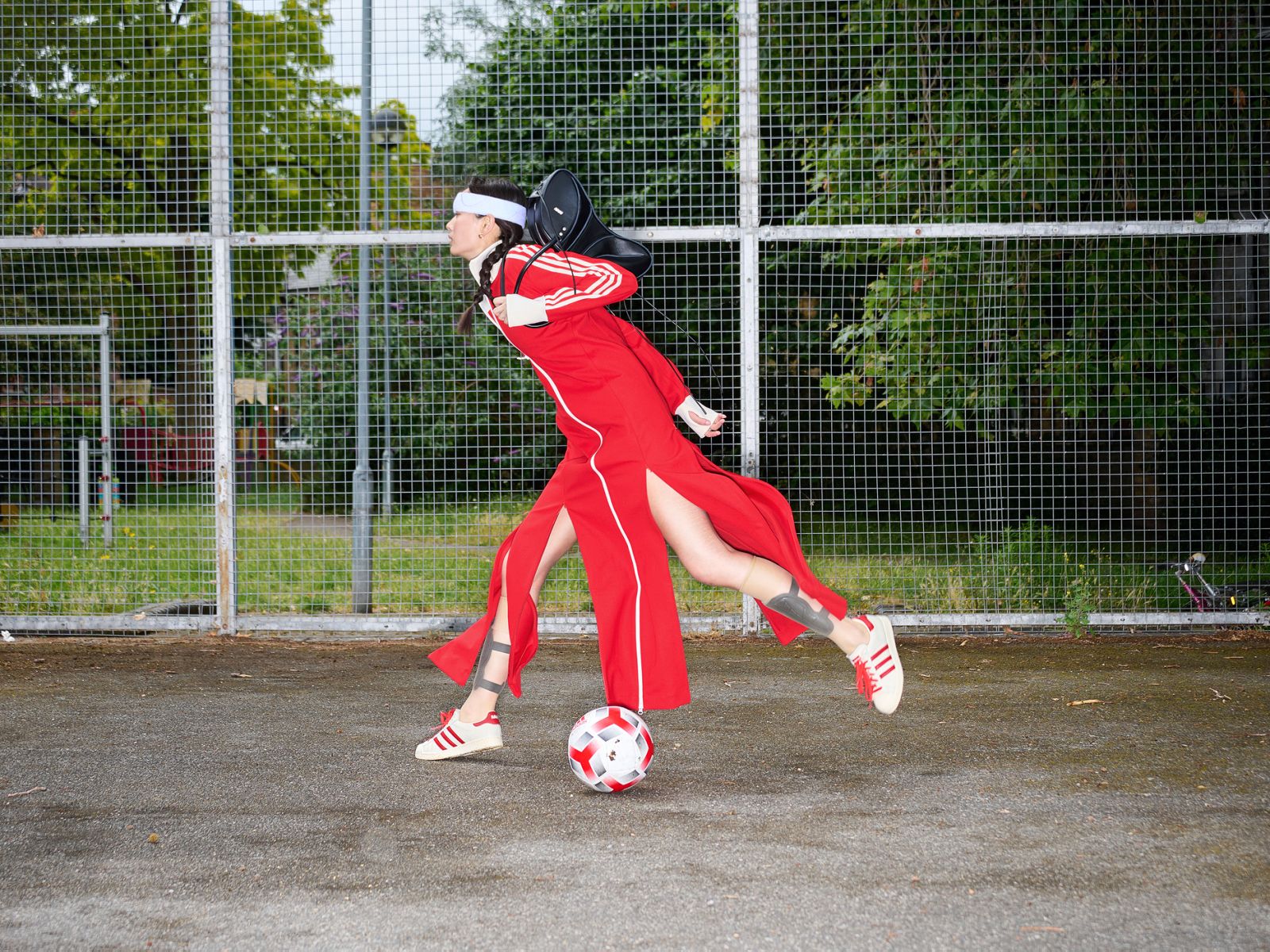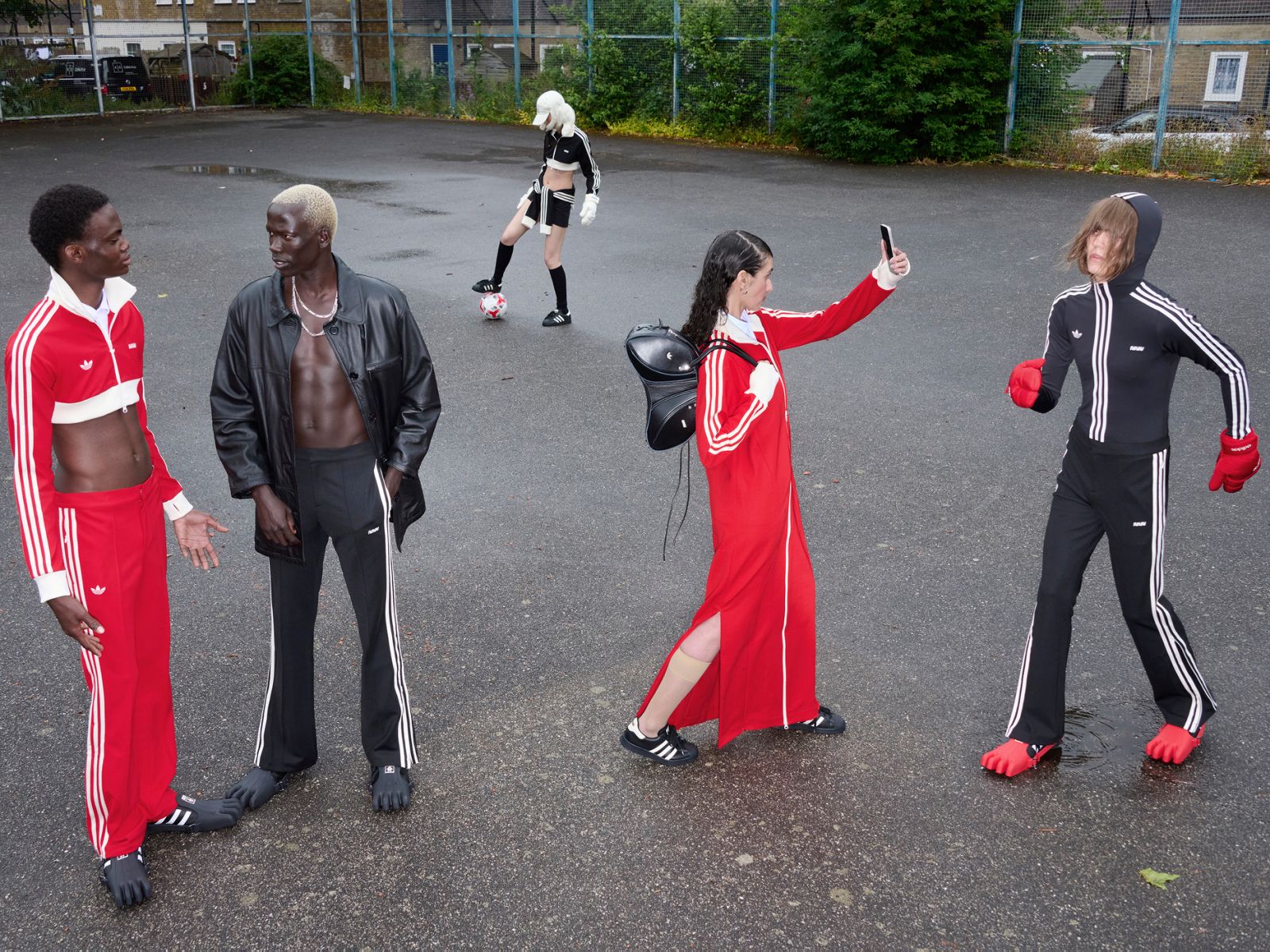 配饰方面也颇具特色,包含了带有手指状切口的帽子、三指足球手套,以及一个同样怪异的 adidas 皮质旅行包。