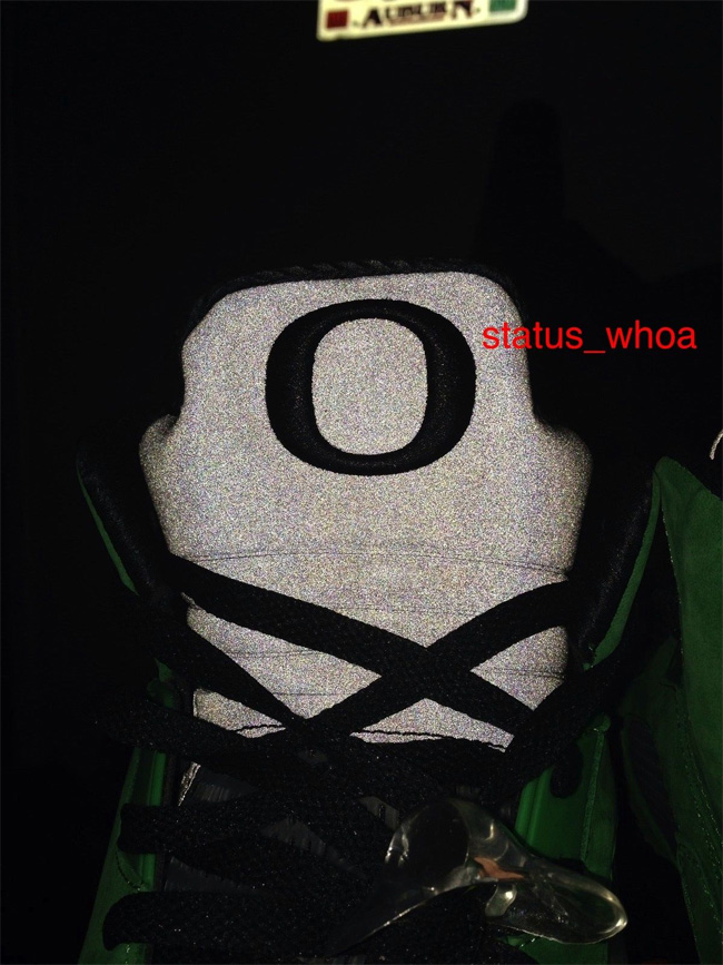 绿色的鞋身搭配黑色的中底,点缀金黄色的喷焰图案,3M 反光鞋舌上带有大写 O 字母,后跟处则有俄勒冈鸭子的卡通形象,鞋垫上布满了鸭羽图案。