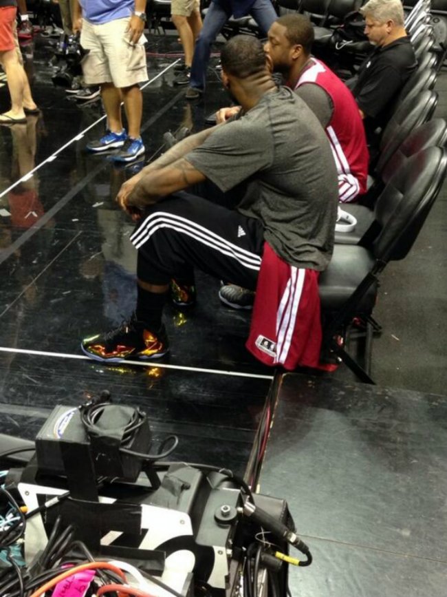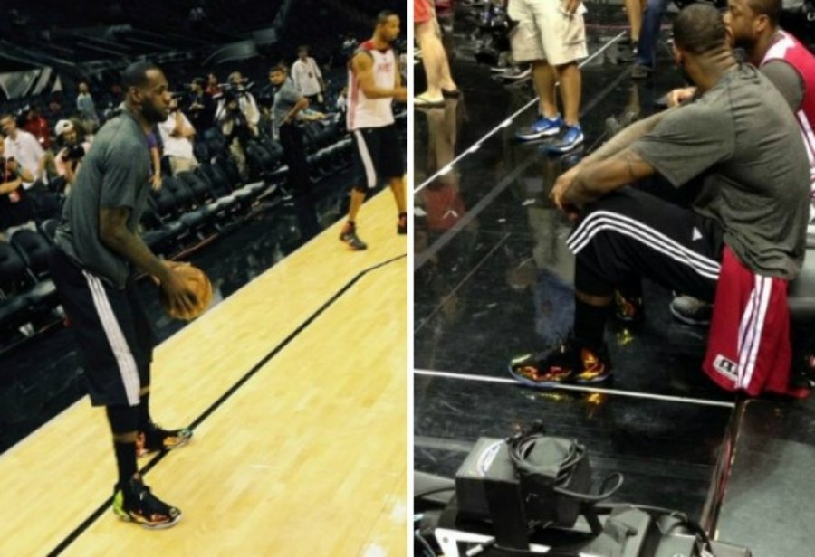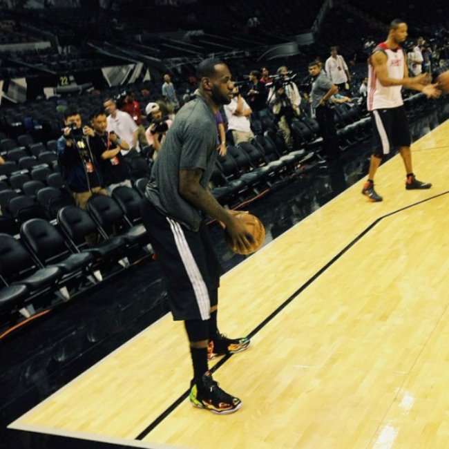 本赛季的 NBA 总决赛即将掀开战幕,而詹姆斯能否率领热火击败马刺,夺得三连冠,延续王者荣耀,是全世界球迷关注的焦点。 在今天的训练赛中,詹姆斯上脚了王者皇冠配色的 LeBron 11 EXT "King's Crown"。贵金属风范的金色搭配沉稳的黑色麂皮,王者的霸气在詹姆斯脚下显现。