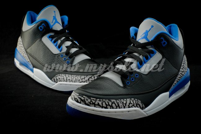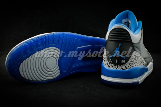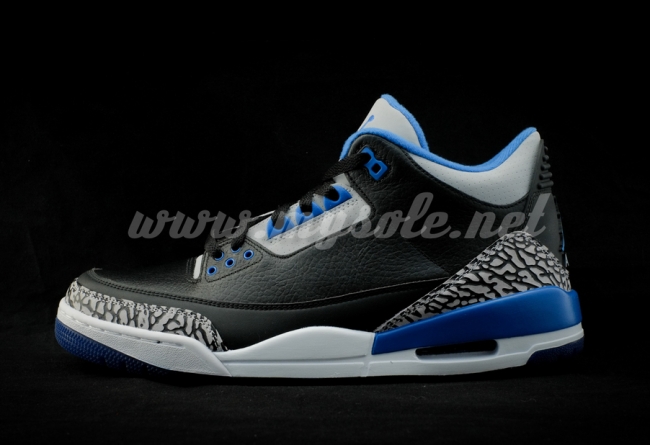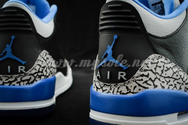 黑色鞋面以运动蓝细节呈现,此番 Air Jordan 3 "Sport Blue" 在沉稳的深色鞋身上以活力十足的运动蓝色作为点缀,带来的视觉反差效果颇为特别,而经典黑灰爆裂纹饰的装扮和黑色鞋面的搭配则继续延续经典风格。