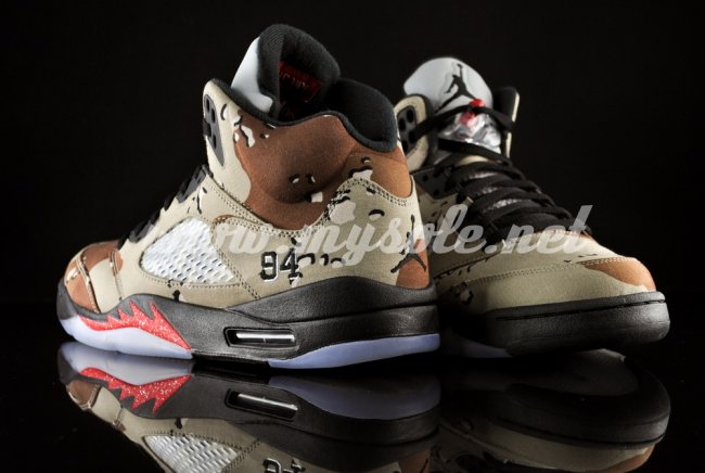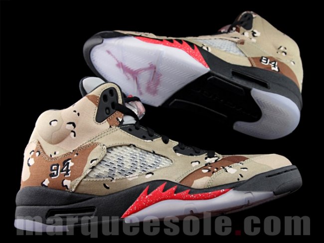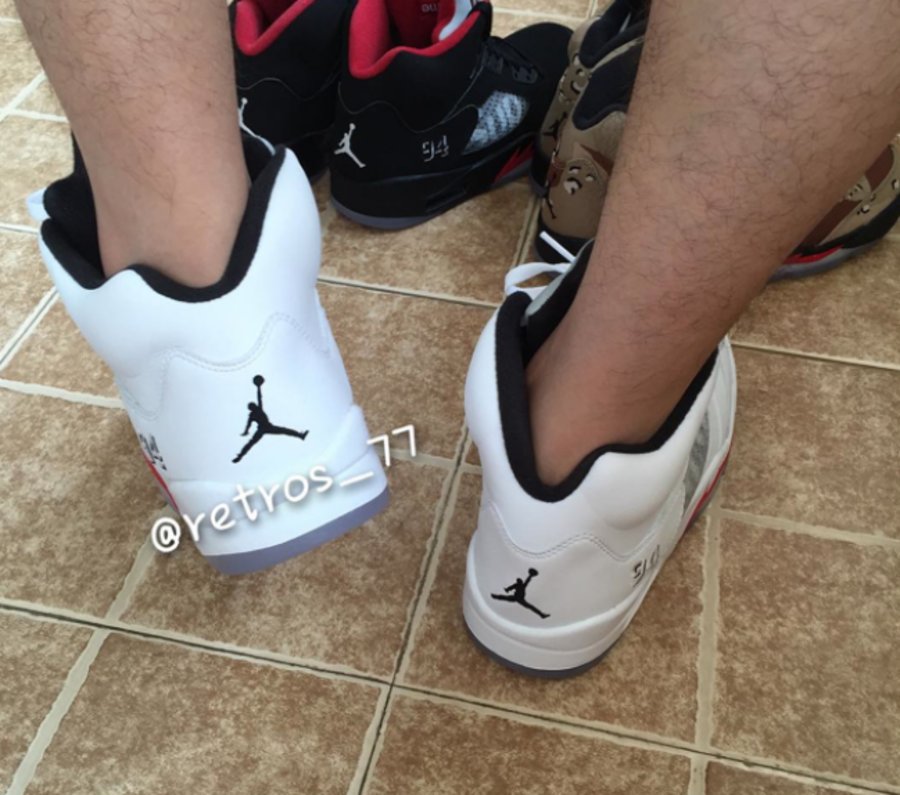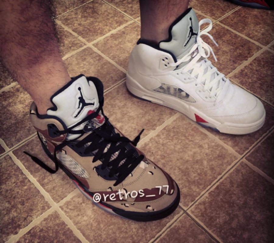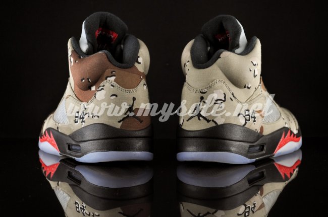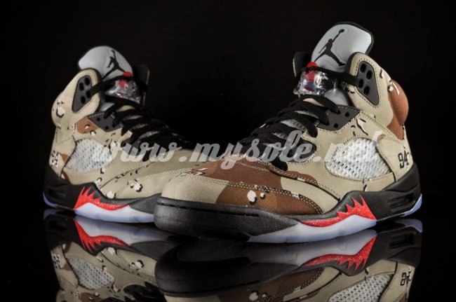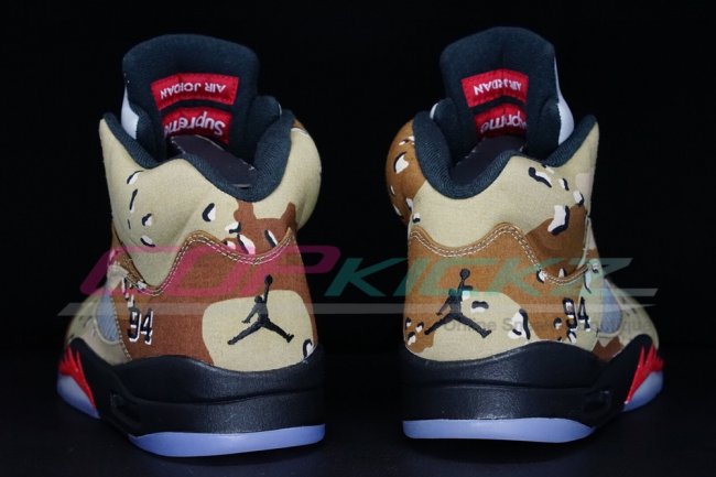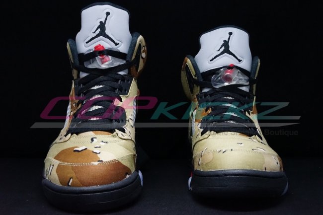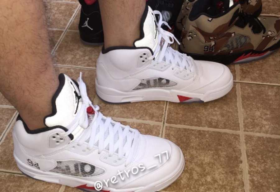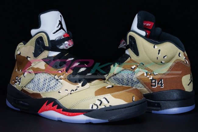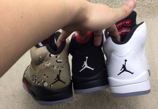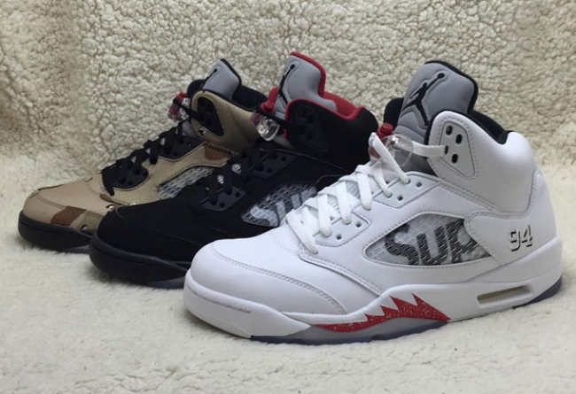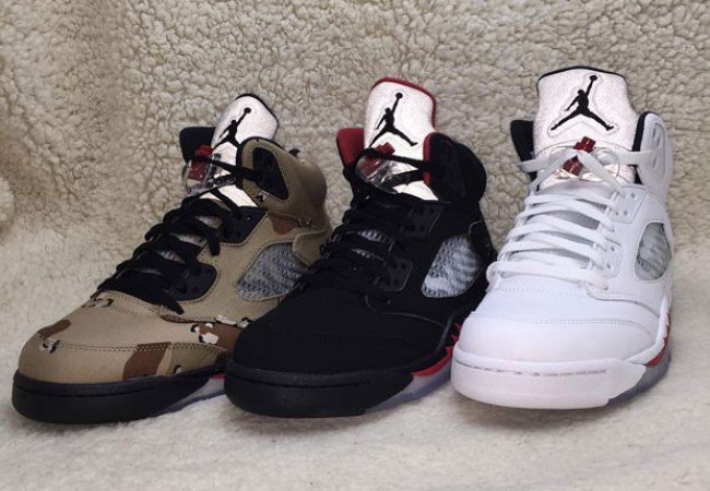 Supreme x Air Jordan 5 三款配色都以银灰 3M 鞋舌和黑红中底呈现,沙漠迷彩、黑色牛巴革、白色皮革,三种不同材质带来三种不同风格,毫无突兀感受的精美呈现,鞋身的 Supreme 元素则注入了全新活力,无论是远观还是近赏,都颇具趣味。