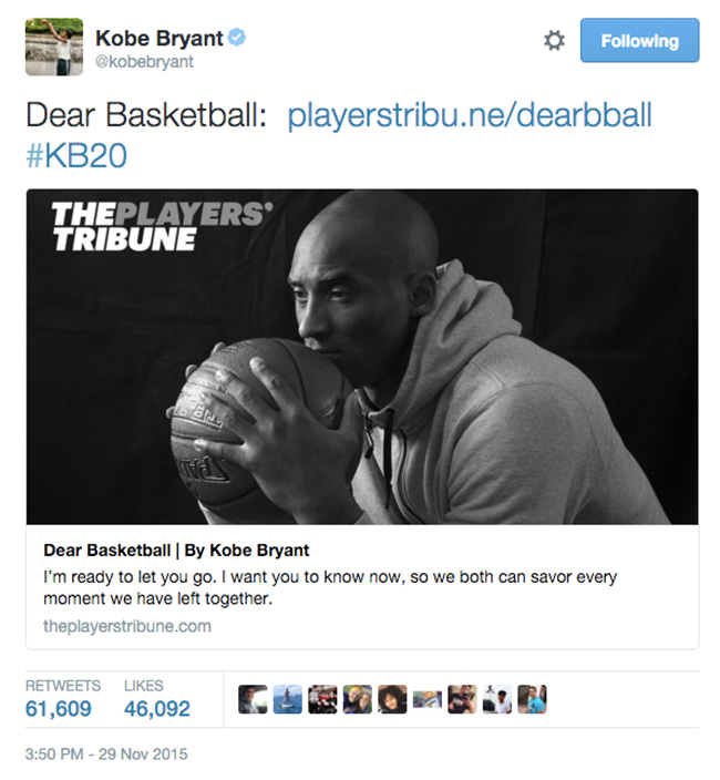 科比同时在自己的 Twitter 上公布了链接,打开网页,里面附带了一首题为《Dear Basketball/亲爱的篮球》的信,表达了此刻感受。他在里面提到 “This season is all I have left to give”,本赛季是我还能给予的全部(泪飙。。。)
