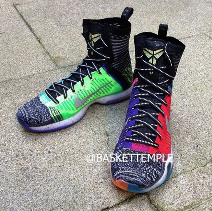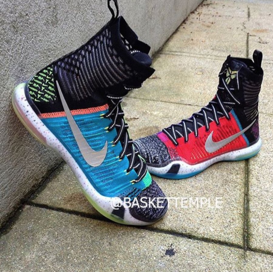 What The 配色再现科比战靴,此番在十代精英鞋款上带来这双 Kobe 10 Elite “What The”。以 Flyknit 编织高帮鞋身呈现出多色拼接的多彩效果,深色的鞋帮辅以金色的鞋舌 Kobe Logo 点缀,鞋头则以 Multi Color 多彩编织效果打造,再以 3M 反光银灰 Swoosh 和蓝水晶外底收尾。