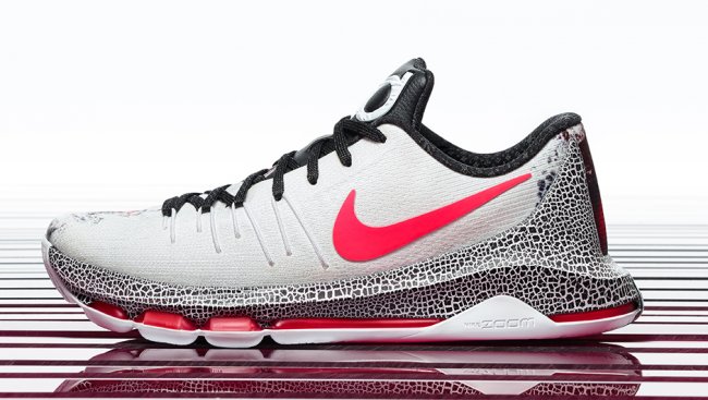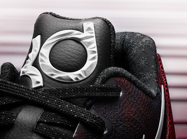 圣诞版 KD8 侧边采用纯白配色,与 Flyweave 鞋面中央的红黑图案设计形成强烈对比,营造活泼而不失细腻的出彩风格。中底包裹在鞋跟稳定器中,依托裂纹设计生动呈现出煤炭炽热燃烧的火热观感。