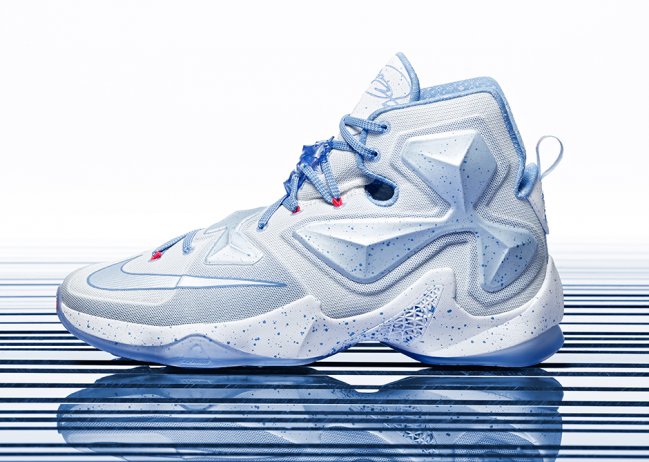 以中西部严酷冬季为灵感的冰蓝色元素贯穿 LEBRON 13 的整体设计,而鞋带眼扣、珠光蓝 Hyperposite 技术以及鞋跟上灵感来自碎冰的“13”图案均巧妙点缀新颖的圣诞细节,塑就耀眼风采。