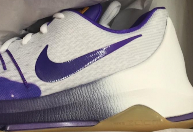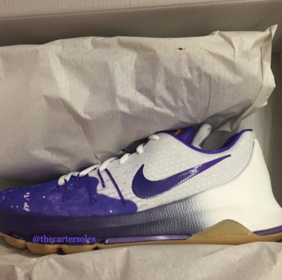 PBJ 配色再现杜兰特战靴,以阿杜儿时最爱的花生黄油和果酱为主题,在 KD 8 鞋型上带来这款 KD 8 “Peanut Butter & Jelly”。 此番采用了白色鞋身为背景,鞋头晕染和 Swoosh 均以紫色带来果酱般的视觉效果,渐变中底搭配生胶外底,预计将于近期发售。