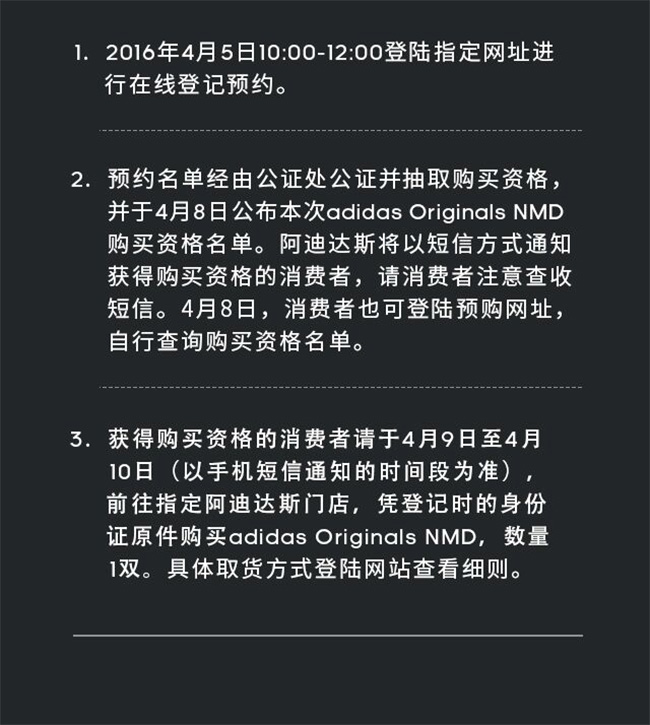 - 获得购买资格的消费者请于4月9日至4月10日(以手机短信通知的时间段为准),前往指定阿迪达斯门店,凭登记时的身份证原件购买adidas Originals NMD,数量1双。未到场购买或登记信息与身份证原件不一致,则将视同放弃购买机会。有效凭证:登记者本人有效身份证件。