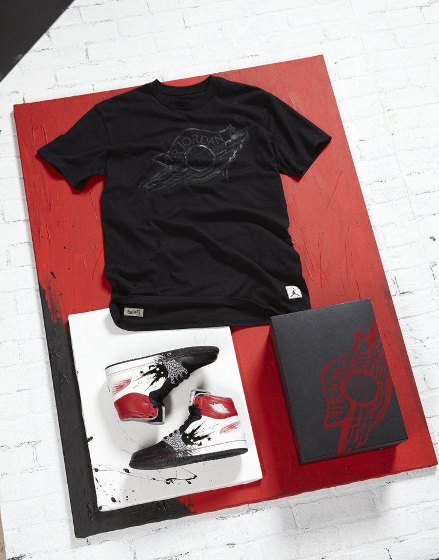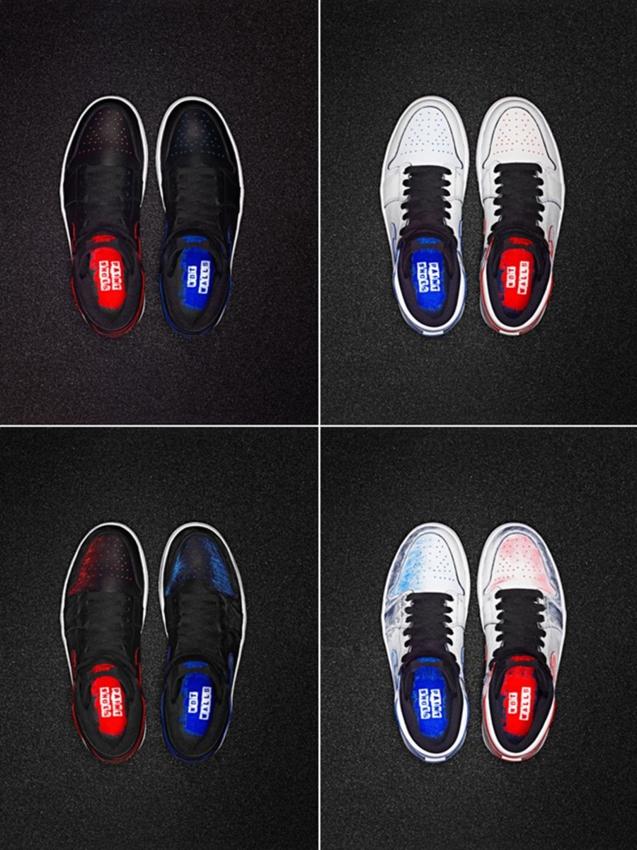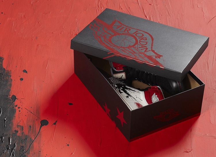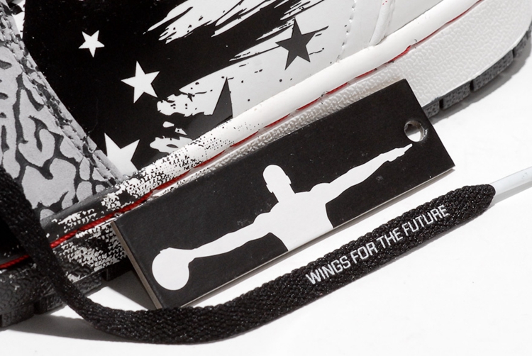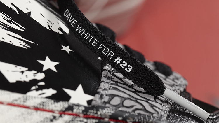 该鞋鞋身及鞋盒内里采用了极具个人特色的泼墨设计,塑造成火星四溅的撞色效果。鞋舌内缝有 Dave White 个人签名,鞋带上印有青少年校园体育运动 Wing for the future 项目的字体,共同预示着此双鞋款的特殊意义。
