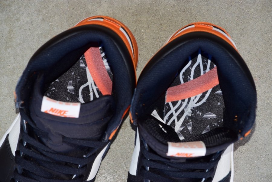 该鞋鞋身采用白黑橙三色优质皮革拼接制成,鞋舌以 Nike Air 刺绣呈现,鞋垫则形象的描绘了扣碎篮板的瞬间景象,在致敬经典鞋型的同时,又颇为契合主题。