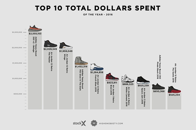 纵览 [2016 年十大销售金额] 排名,全部被 adidas Yeezy Boost (3 席) 和 Air Jordan (7 席)抢占,足以见得 Air Jordan 依然是球鞋界无法撼动的王者。