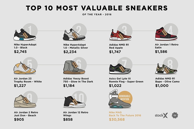 在 [2016 年十大最贵球鞋] 排名中,包揽前两名的鞋款,并非 Yeezy 及 Air Jordan 系列,而是去年 Nike 以 $720 美元为发售价强势推出的自动系带鞋款 HyperAdapt 1.0(Mag 由于发售数量及形式限制,并未列入榜单)。