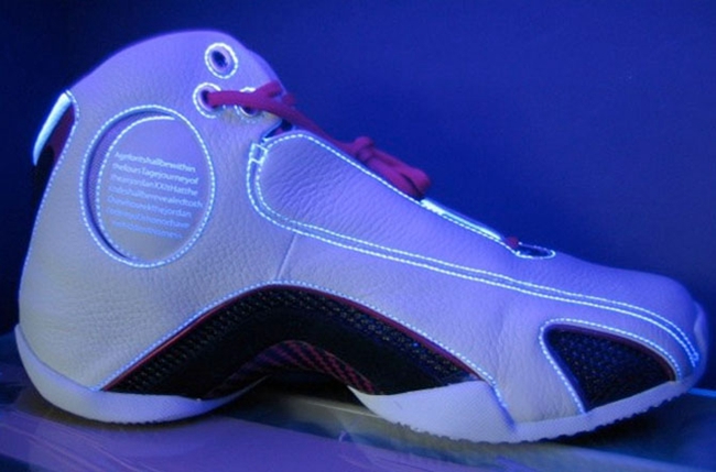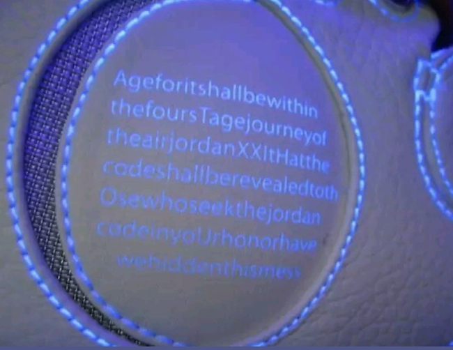 最后是 Air Jordan 21 最为值得称道的设计,也是许多朋友不曾了解的细节。在鞋帮内侧,圆形的车线包裹中,使用紫外线照射,会出现一段英文内容。