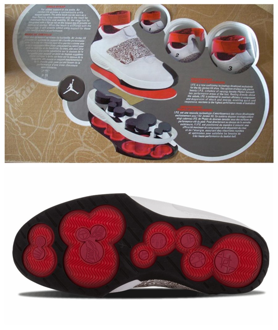 此番 Air Jordan 20 并没有执着于 AJ18 所引领的双层 Zoom 浪潮,而是另辟蹊径的引入了全新的 I.P.S (Independent Podular Suspension) 缓震系统。该系统将 20 个排列紧密的弹力柱按人体工程学分布在足部的 20 个受力点上,通过吸收运动中的地面冲击,来起到减震回弹的效果。