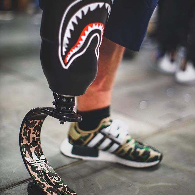 相信大家都看过这张球鞋上脚图片,BAPE x adidas NMD 联名固然抢夺眼球,但同样的潮流迷彩装扮覆盖于刀锋假肢之上,更让人震撼!