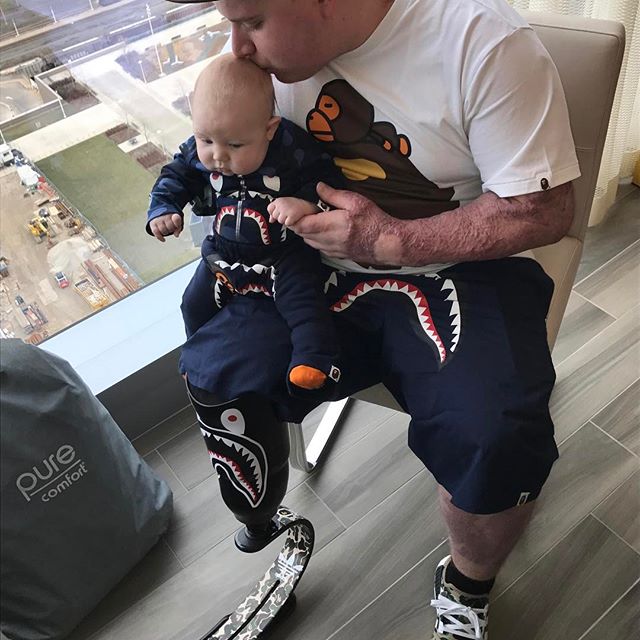 不仅丢失了右腿,从头到手到脚都有深深的伤疤
