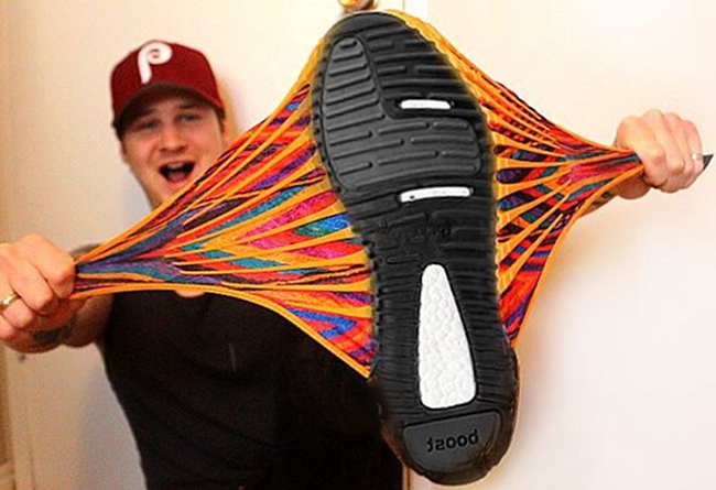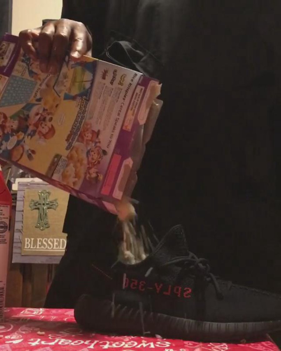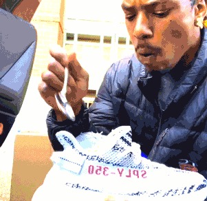 此番他再度对 Yeezy 下手,而且是前阵子货量极其稀少的白斑马!在鞋底挖了个洞,将其硬生生改造成了手机壳!还一脸自豪的给妈咪打电话!