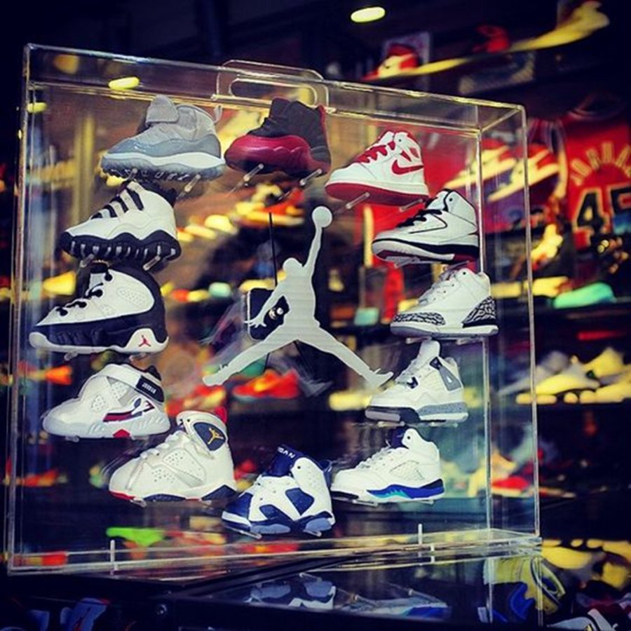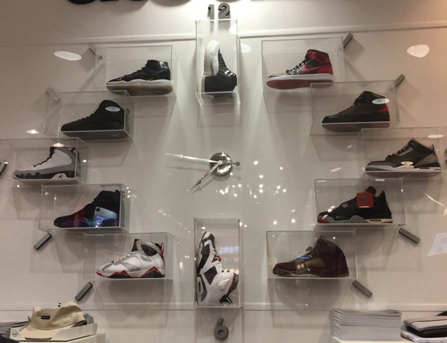 常见于将正代 Air Jordan 1 至 12 摆成一圈,在最中间处放上时针分钟及秒针。