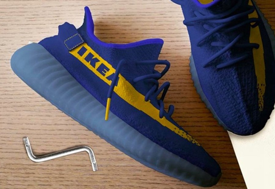 拥有极高人气的 adidas Yeezy 350 Boost V2 也加入这场恶搞之中,以一抹蓝色装扮为主基调,标志性的油漆线条则以亮眼的黄色示人,并配以 “IKEA” 字样,说明书也煞有其事的一并呈现,恶趣味十足!