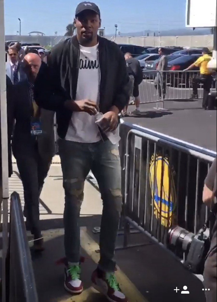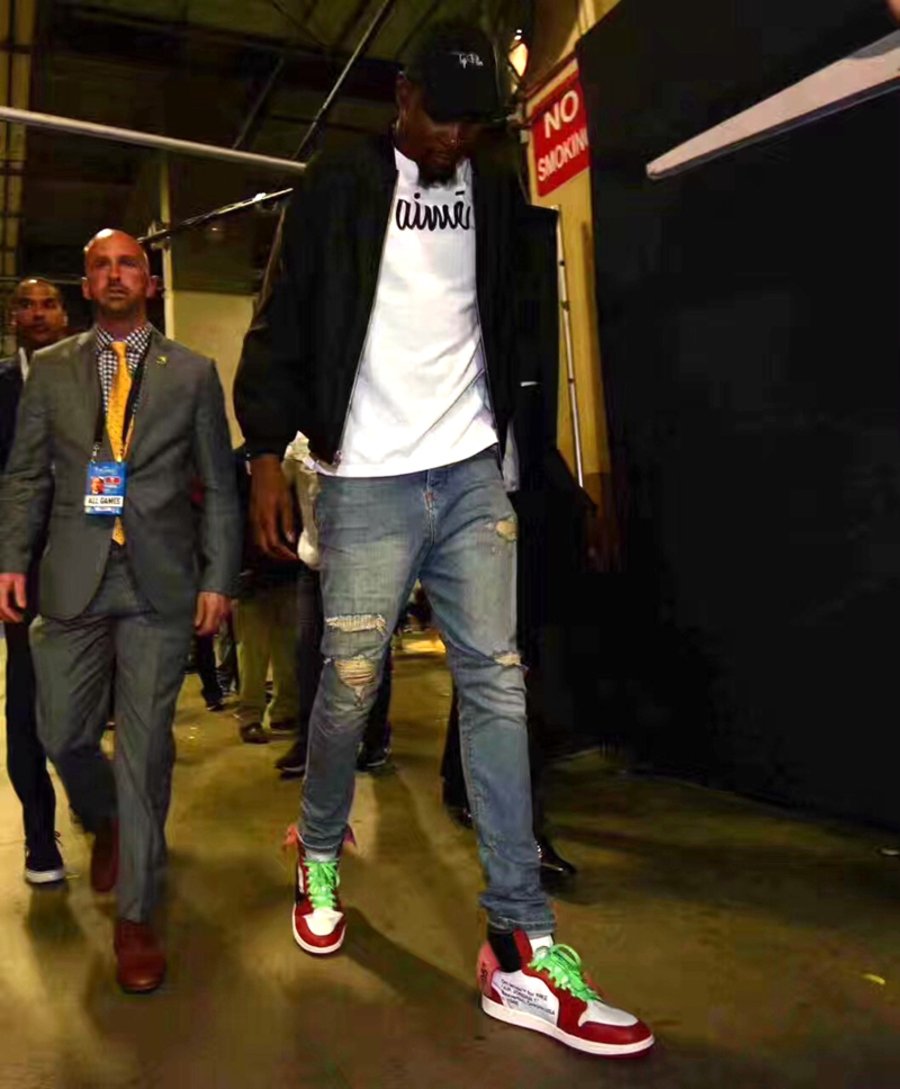 此番勇士队球星凯文·杜兰特身着休闲便装出现在球场之外,不仅上脚了还未发售的 OFF-WHITE x Air Jordan 1,还别出心裁的搭配上荧光绿色鞋带!