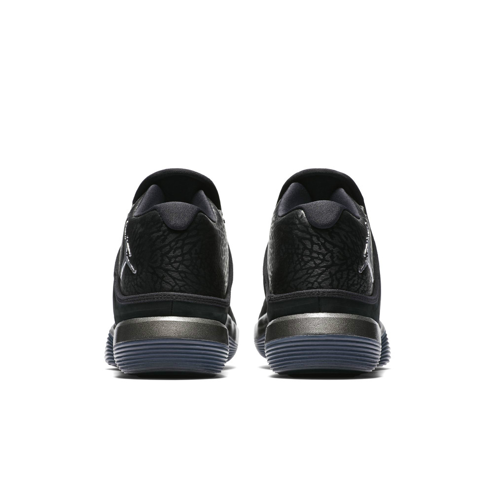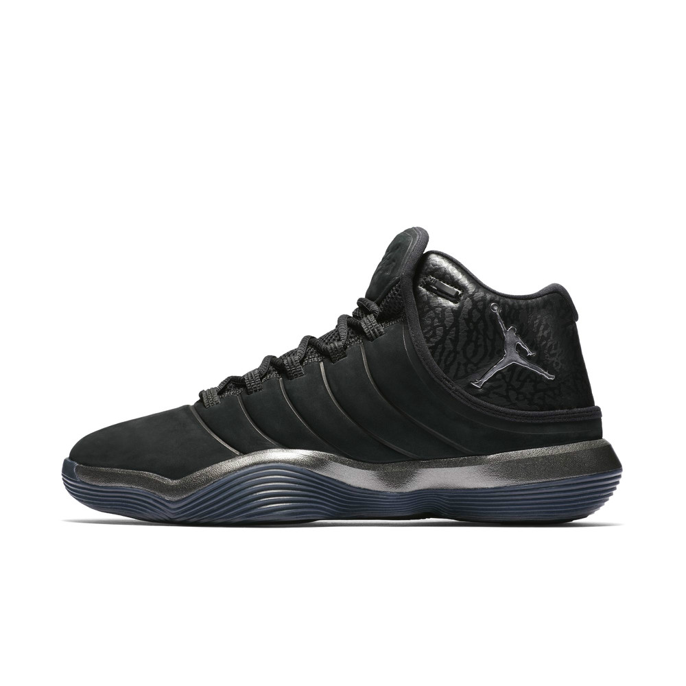 这款 Jordan Super.Fly 2017 采用黑色麂皮鞋身,鞋帮则是光亮的荔枝皮打造,并带有经典的爆裂纹路,银色的飞人标志则格外的夺目!