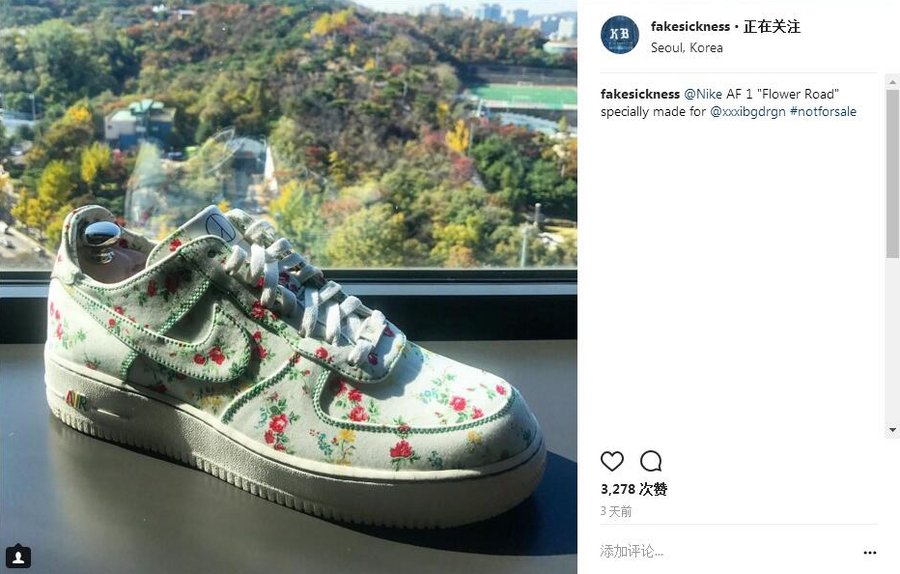 今年恰逢经典鞋款 Nike Air Force 1 诞生 35 周年,全球各路潮流大咖都在为此而庆祝,本次来自韩国的设计师 @fakesickness 便为 G-Dragon 权志龙特别制作了一双 Air Force 1 专属定制鞋款! 这款 Air Force 1 定制版本以 “Flower Road” 为主题,鞋面布满红绿两色碎花图案,鞋舌及鞋带扣更是缀有 GD 个人时尚品牌 PEACEMINUSONE Logo 彰显主题,颇有一番趣味!