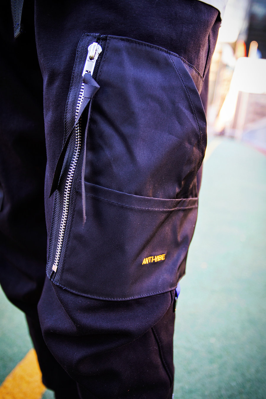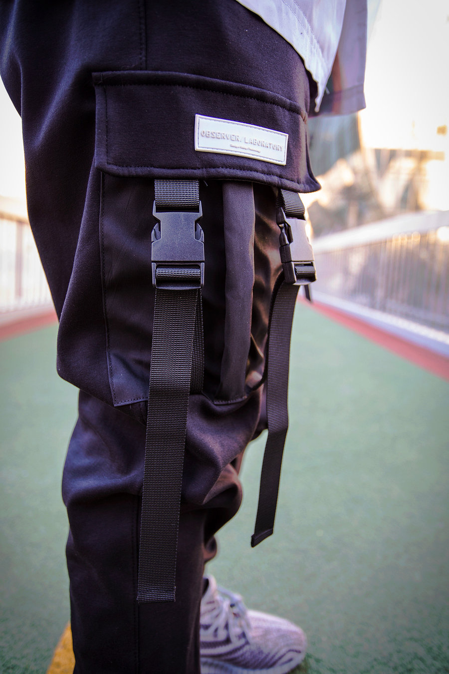 裤装:ROARINGWILD 黑色侧缝不对称袋口束脚裤