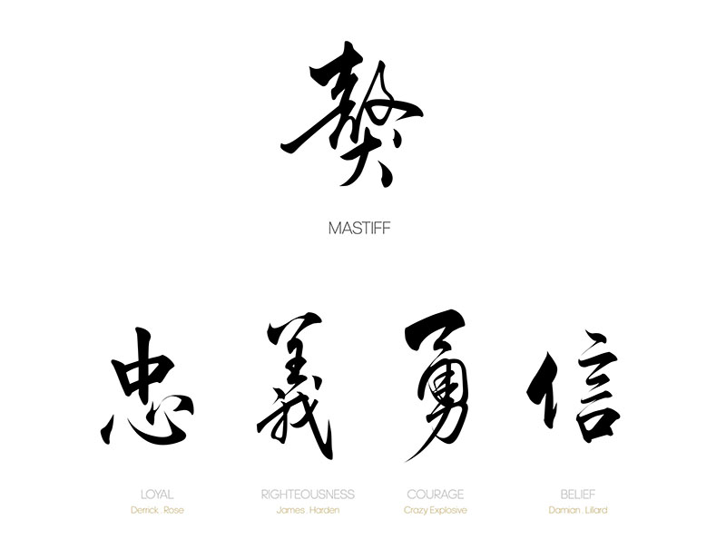 首先这次合作的主题是中国生肖狗,獒又是狗中之王,我就将獒作为狗的代表。再从我的作品中提取出忠、义、信、勇四种精神,根据每位代言球星的性格特征和我与他们接触时的感受,将这四种精神分别与他们相匹配,也就赋予了每双球鞋独一无二的特质。