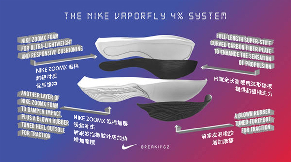 以 Breaking 2 为目标,Nike 带来名为 ZoomX 的全新缓震系统!不仅只有传统发泡缓震材质重量的 1/3,能量的回馈率也高达 85%,而传统跑鞋的能量回馈仅在 40~60% 之间,adidas Boost 材质为 70%,率先搭载到为职业马拉松选手打造的 Nike Zoom Vaporfly Elite 中。
