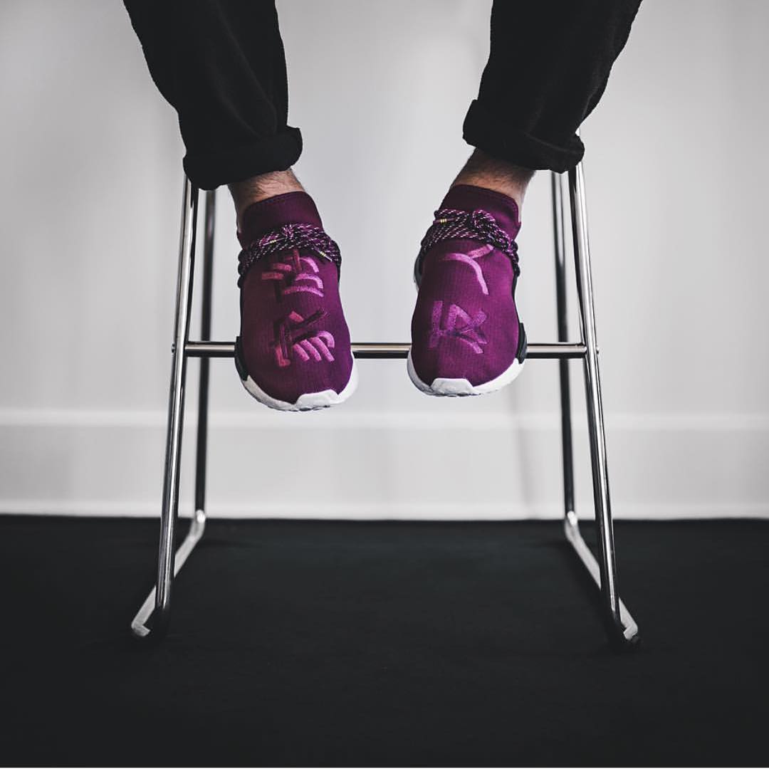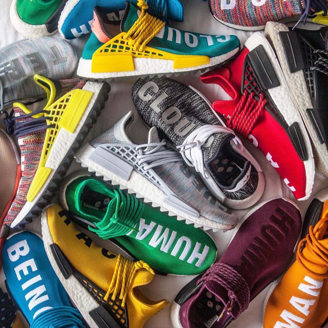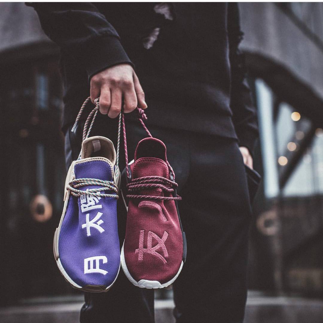 除了坎爷,adidas 签约的另一位带货王就是菲董 Pharrell Williams,双方联名的 adidas NMD HU 也是出一双涨一双,除了鲜艳的色彩是其一大特点之外,醒目而独特的标语刺绣更是人们追捧的原因之一。