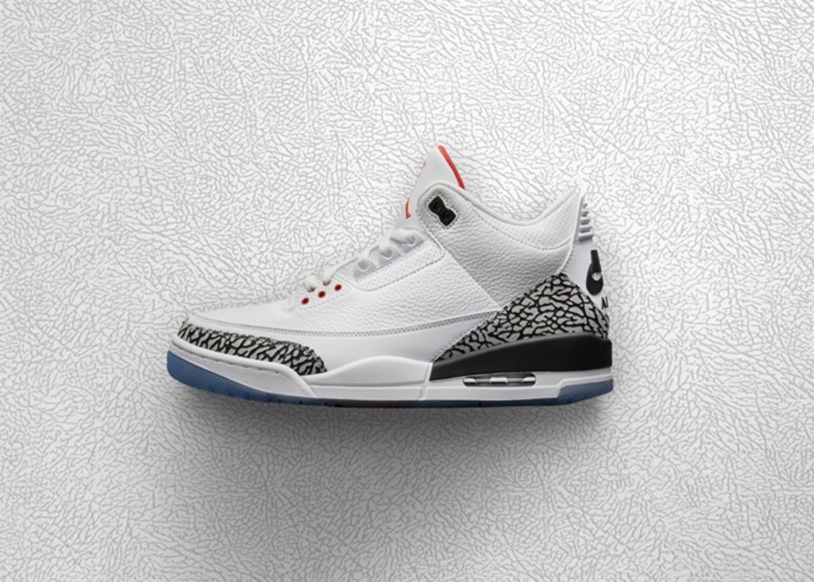 黑、白水泥 AJ3 首次在同一年复刻,在遵从元年设计的基础上,加入冰蓝色水晶外底,鞋底点缀的一道红色条纹代表扣篮时踩到的罚球线,向 1988 年乔丹罚球线起跳扣篮致敬。