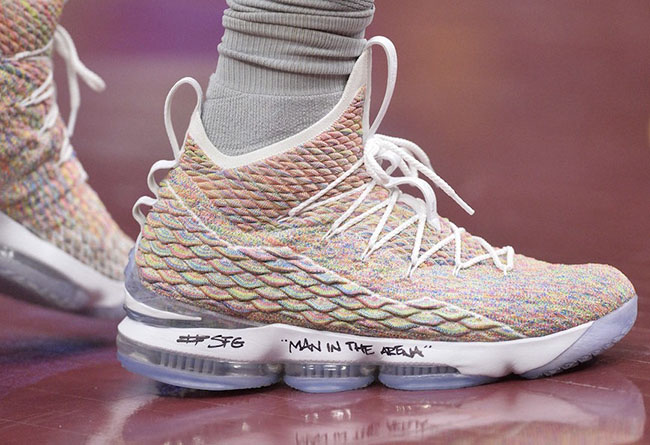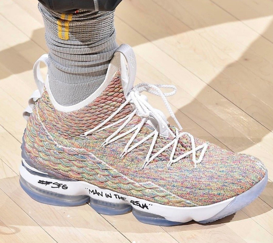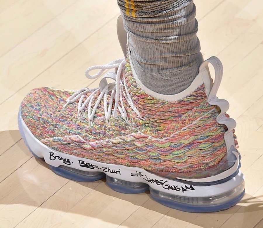 经典的水果麦片配色再次降临 LeBron 正代系列,灵感来源于 Fruity Pebbles 果味麦片缤纷的颜色,此款 LeBron 15 “Fruity Pebbles” 在今日赛场被詹皇亲着。 BattleKnit 编织鞋身更加细腻的呈现五彩斑斓的水果色气氛,标志性的后跟稳定片特别以透明材质呈现,与冰蓝水晶大底相呼应,颜值不俗。 目前虽为公布正式发售信息,相信按照惯例市售可能极高,不妨耐心等待!