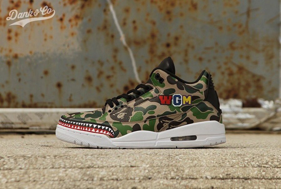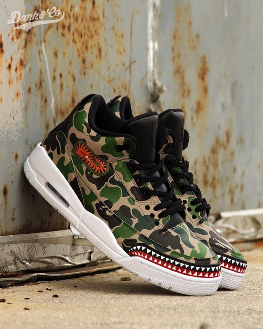 更早在 2017 年 4 月就制作出与今年 BAPE x DAME 4 同样风格的 Air Jordan 3,鞋头爆裂纹以鲨鱼齿替代,街头战斗气息十足!
