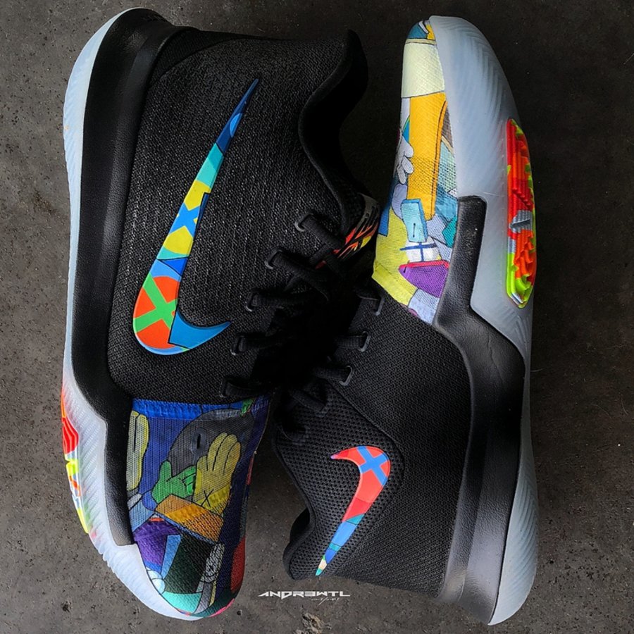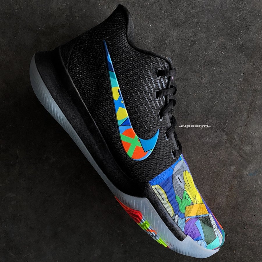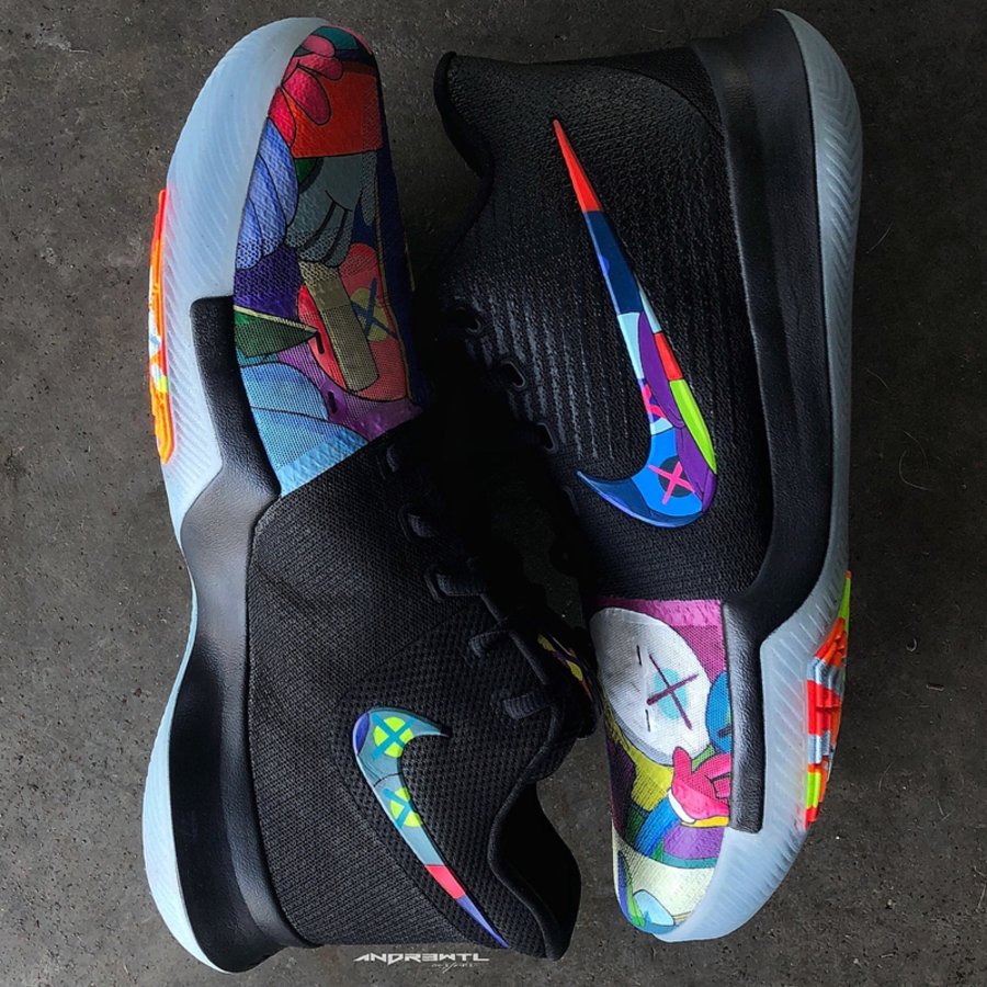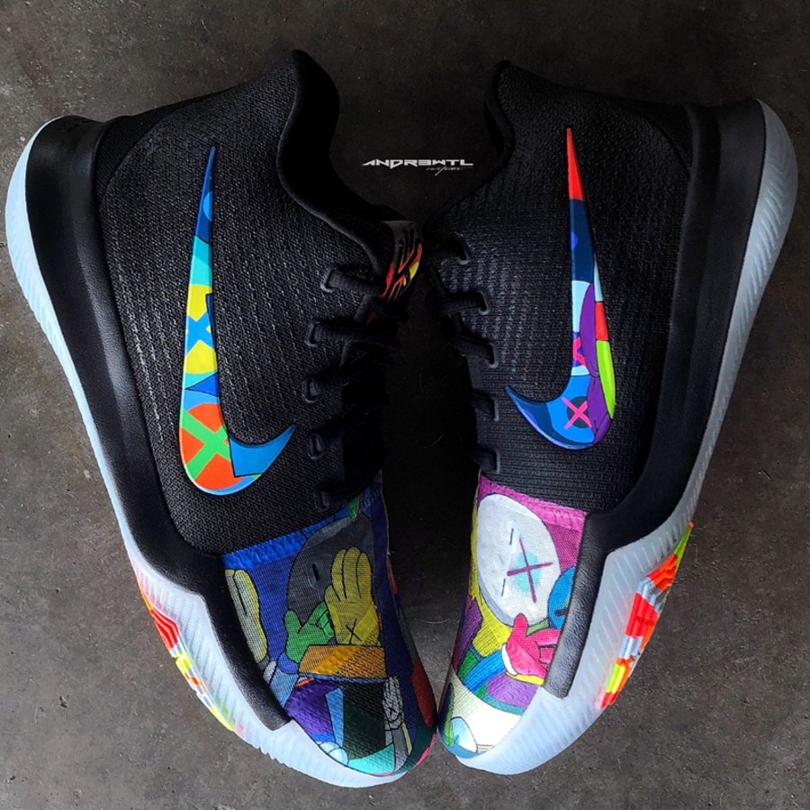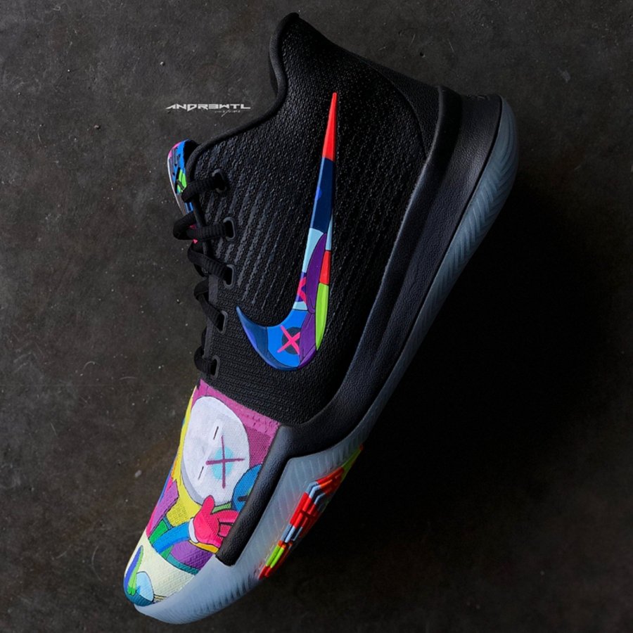 同样以 KAWS 为主题,来自明尼苏达的知名定制师 Andrew Lewis 采用个人擅长的醒目撞色搭配精美涂鸦细节,将 Kyrie 3 鞋头及内外侧 Swoosh 点缀上缤纷涂鸦。