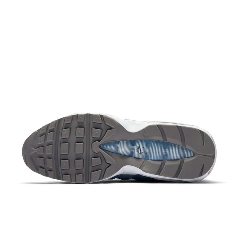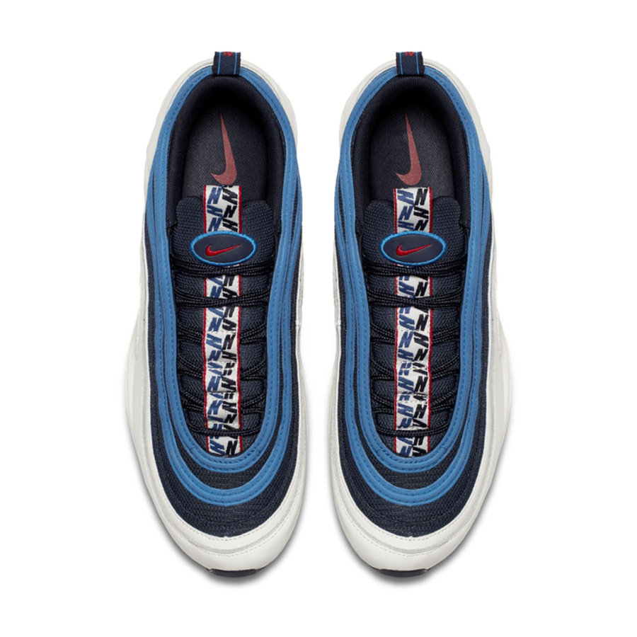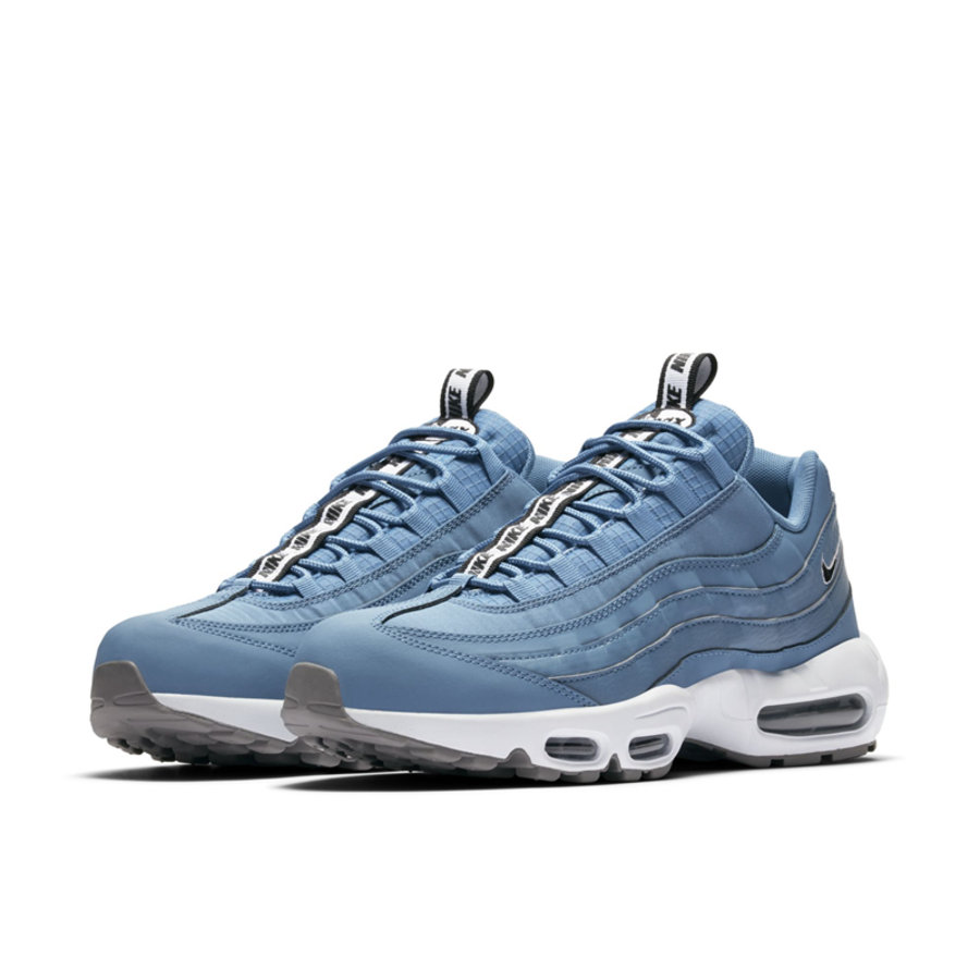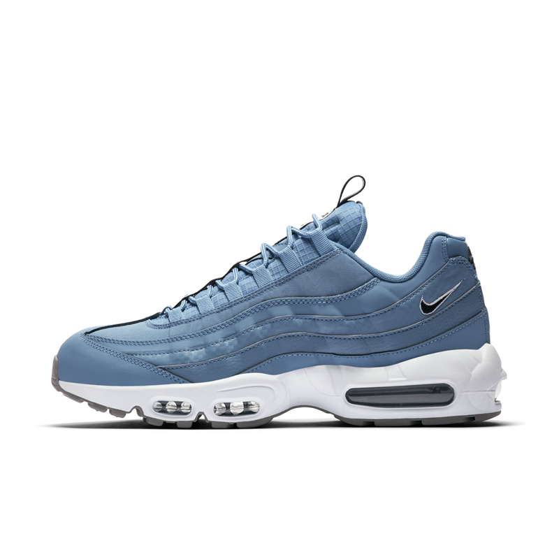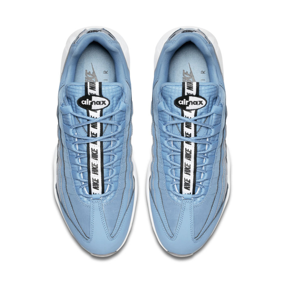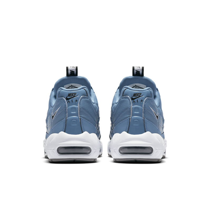 延续了之前鞋舌串标织带设计,配色方案均以蓝色为主色调。Air Max 97 为海军蓝织物搭配白色皮革鞋面,以浅蓝色反光条点缀,织带串标是与之前一样的字母 “N”。Air Max 95 则是浅蓝色鞋面,串标变为了 “NIKE” 字体。