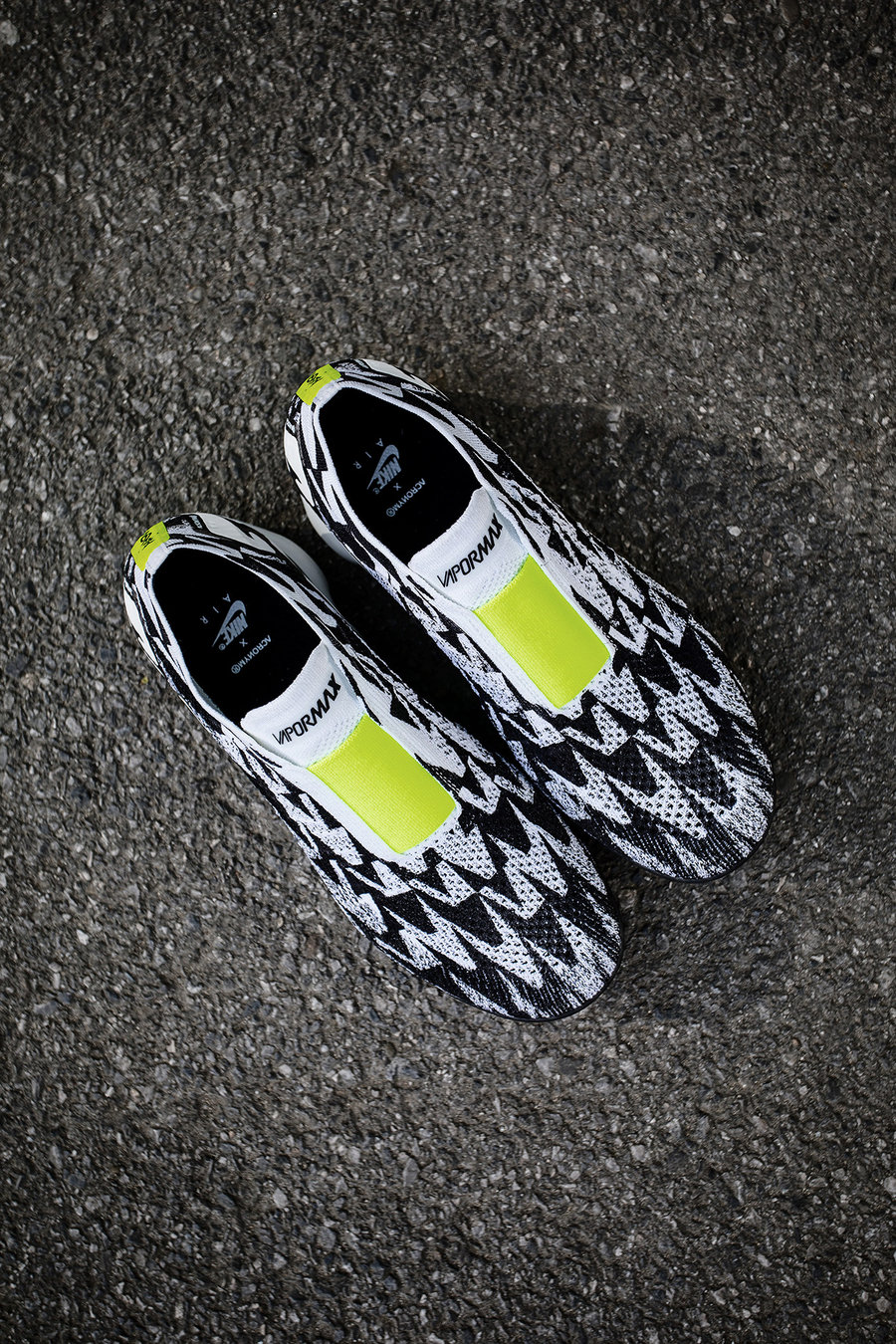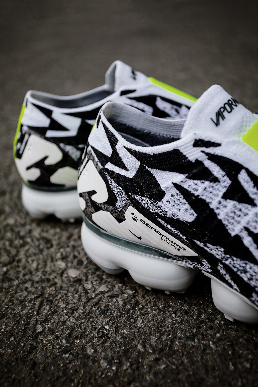 Flyknit 编织鞋面采用了黑白迷彩纹理,其灵感来源于 ACRONYM 标志中的字母 A,主理人 Errolson Hugh 通过将字母 A 的变形和组合,呈现了独特的富有个性迷彩纹路。