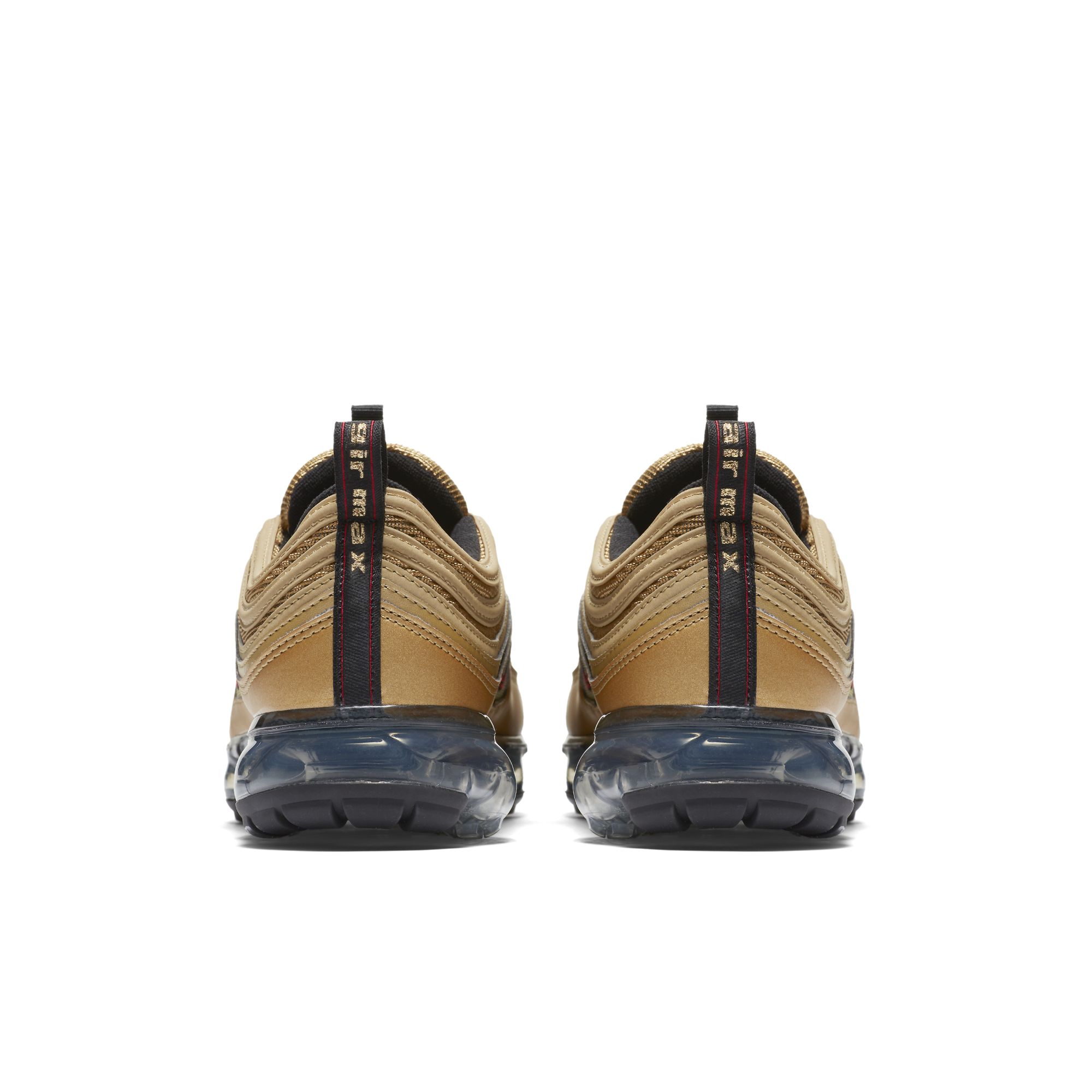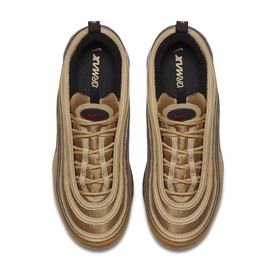 在上月底带来 “Silver Bullet” 银子弹配色的 Nike Air VaporMax 97 之后,近日网上又释出金子弹配色 Nike Air VaporMax 97 的官图。 鞋款将 VaporMax 的气垫与 Air Max 97 经典的元年金子弹配色相结合,同样搭载透明气垫,相比银子弹配色更具醒目浮夸的气质。 鞋款目前尚未公布具体发售信息,有可能将在近日正式发售,我们还将持续关注并带来相关报道!
