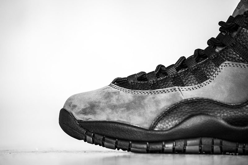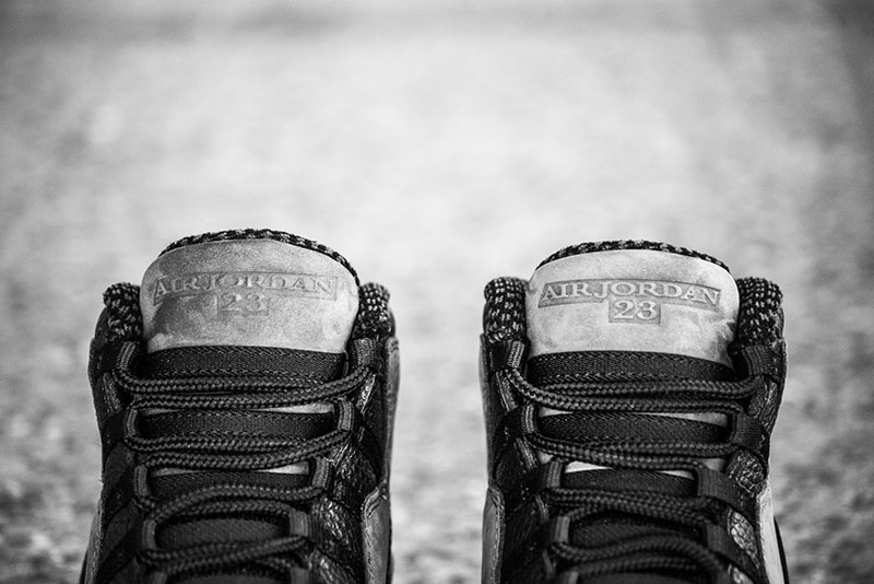 将原有鞋帮上的 23 号刺绣移除,以深灰麂皮搭配黑色荔枝皮,营造更为简约出众的质感表现。