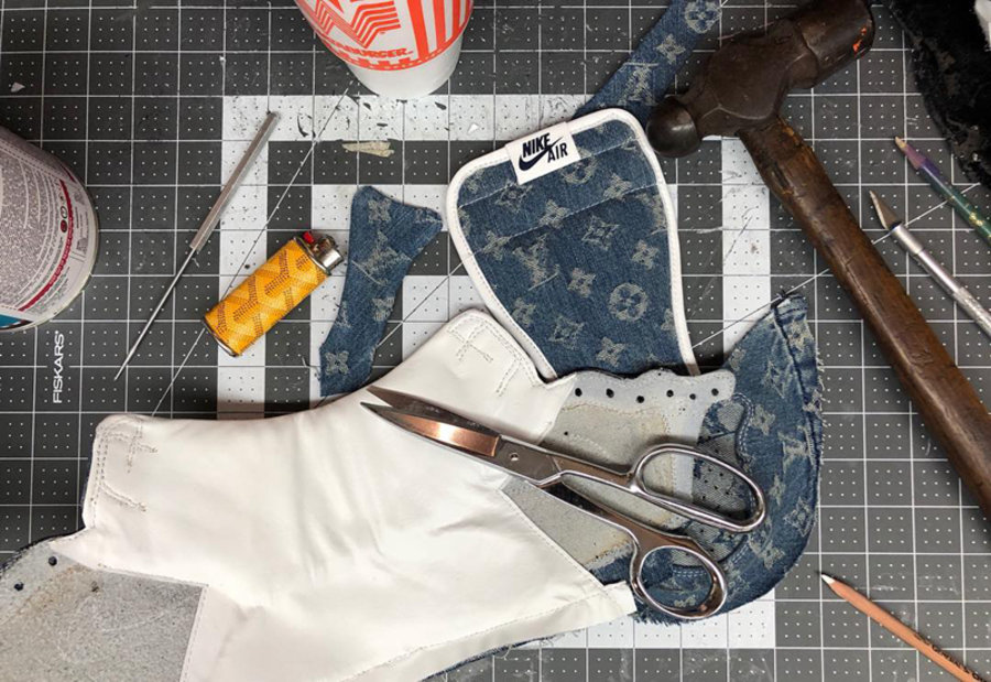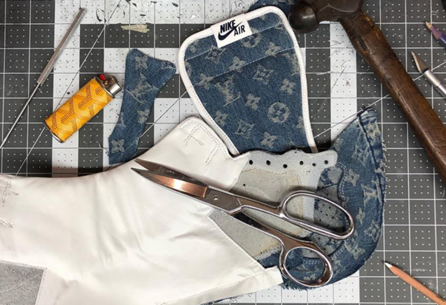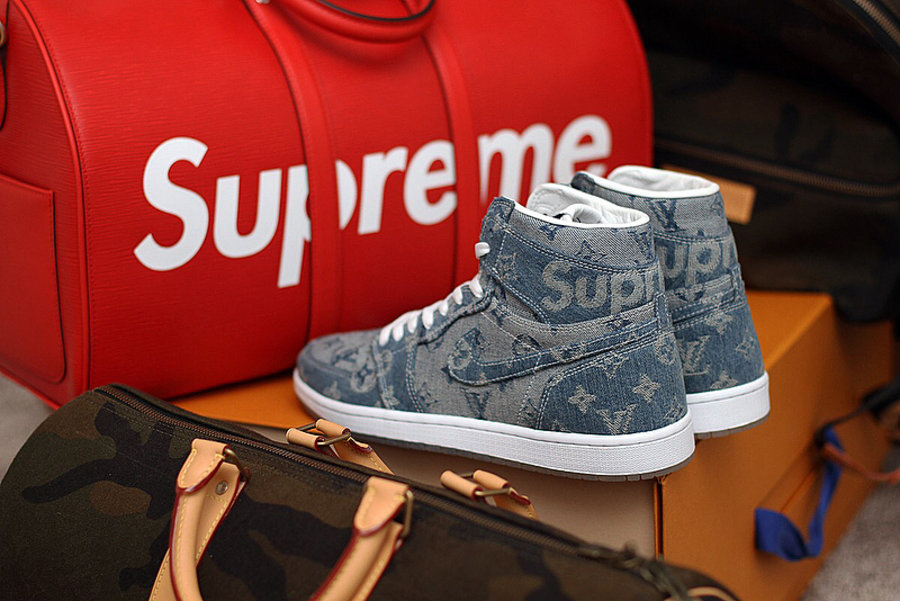 Jake Danklefs 则是把一条 LV x Supreme 牛仔裤剪成了短裤,用剪下来的裤腿布料制作了一双 AJ1。完成的效果极佳,看来还是要用正版材质打造才能保持原汁原味。