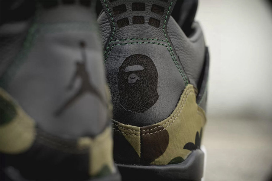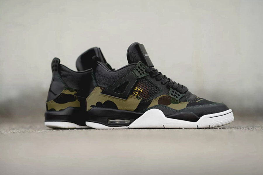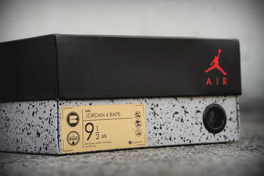 澳洲定制单位 BespokeIND 就经常能作出胜似官方的定制款。这双 BAPE 主题 AJ4 将鞋面材质换为迷彩布和高级皮革材质,镭射、印花、魔术贴等设计一个不少,连鞋盒贴纸都有定制版,展现出不输大牌的设计水平和制鞋工艺。