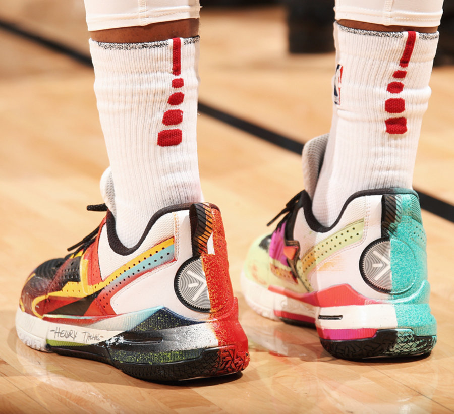 kickstradomis 也善于绘画,同样征服了 NBA 球员。勇士队新秀 Jordan Bell 就曾上脚他打造的贝吉塔定制版 PG1。