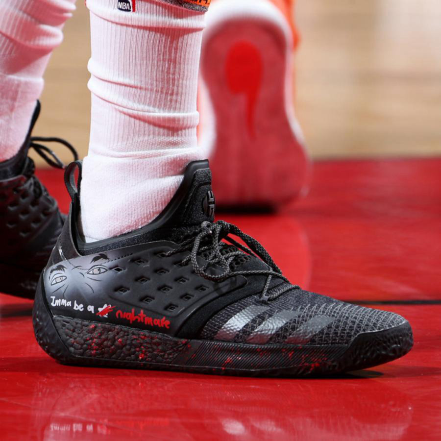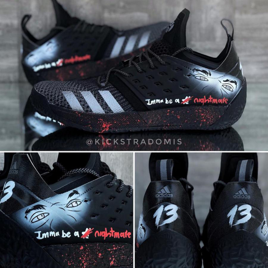 上文提到的 kickstradomis 不只能征服新秀,哈登也曾在比赛中亲穿他打造的 adidas Harden Vol.2 梦魇定制版。虽然绘画面积并不大,但手写字体和犹如血液的红色细节极好的渲染了恐怖氛围。