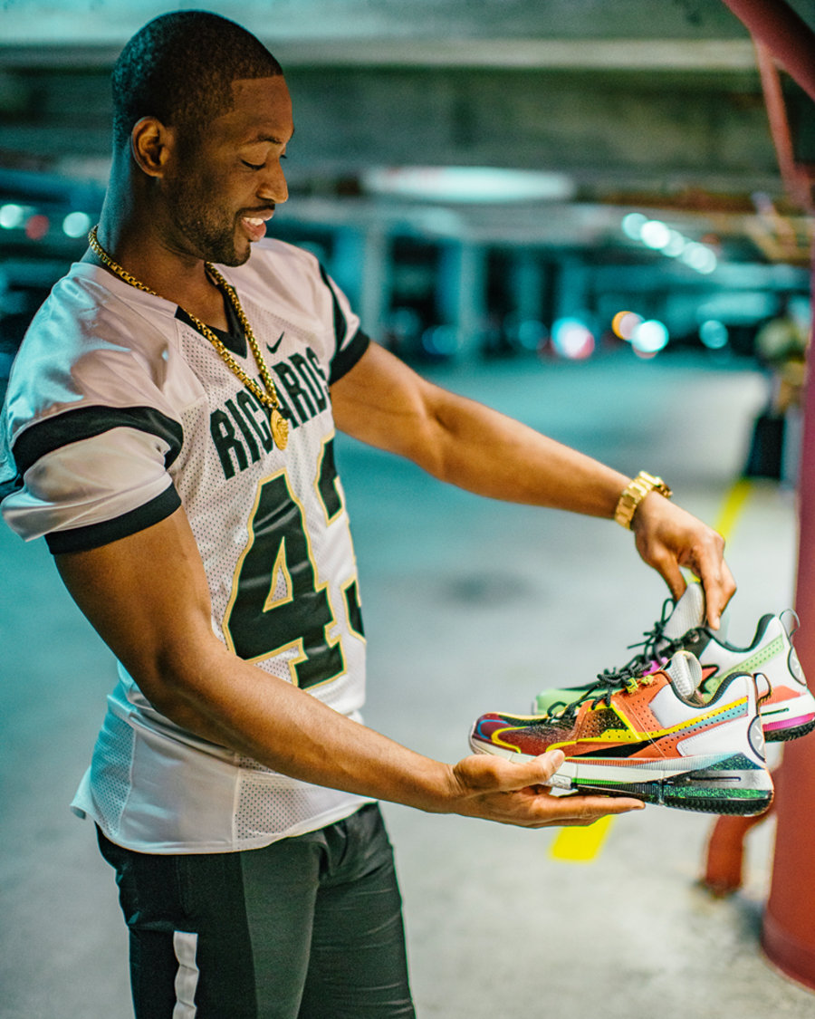 有些品牌不敢实现的疯狂想法定制大神却能实现。涂鸦艺术家 Rey Jaffet 就为韦德打造了一款疯狂的 All City 6。用色极为大胆,球鞋左右两面一面为纯色直接喷涂,另一面为彩色绘画,风骚的配色韦德十分青睐并在比赛中上脚。