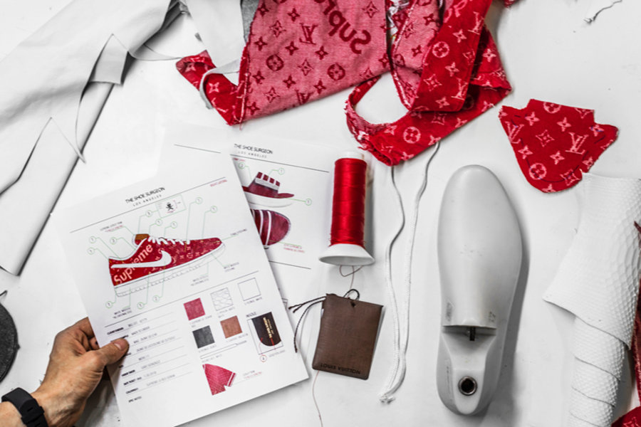 以奢华定制著称的 The Shoe Surgeon 也打造过 LV 主题鞋款,使用取材于 LV 皮包的标志性皮料,蓝本则是同样价格不菲的 OFF-WHITE x AJ1,打造出极致奢华的效果。
