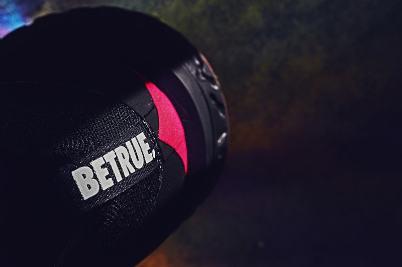 鞋款整体以黑色为主调,后跟处的粉色三角、“BETRUE” 字样与外底的彩虹水晶底都彰显出这双鞋的 LGBT 主题,与整体的黑色产生极大的视觉反差,在低调中更突出亮点与主题。