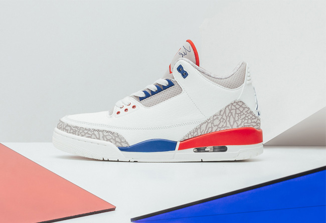 Air Jordan 3 “International Flight” 鞋身依旧以白色为主,鞋头与后跟采用灰色爆裂纹路进行装饰,在中底方面红蓝两色进行活力点缀!
